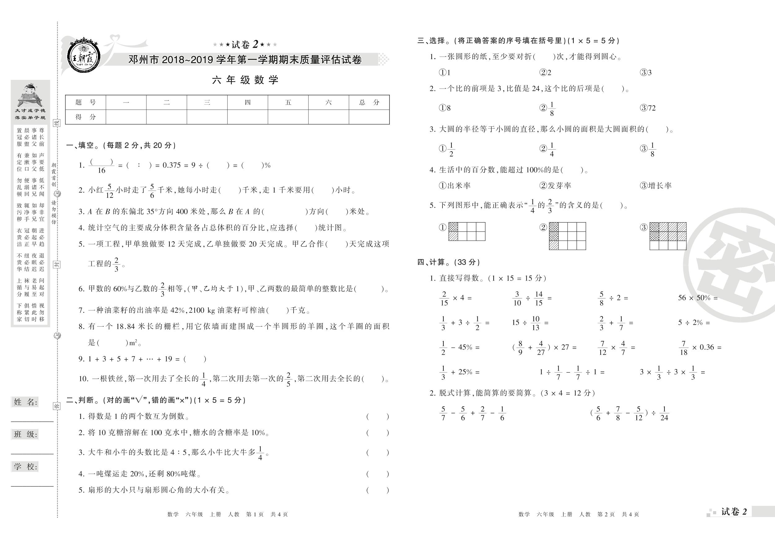 2018-2019学年第一学期邓州市六年级数学试卷(人教版)【2】