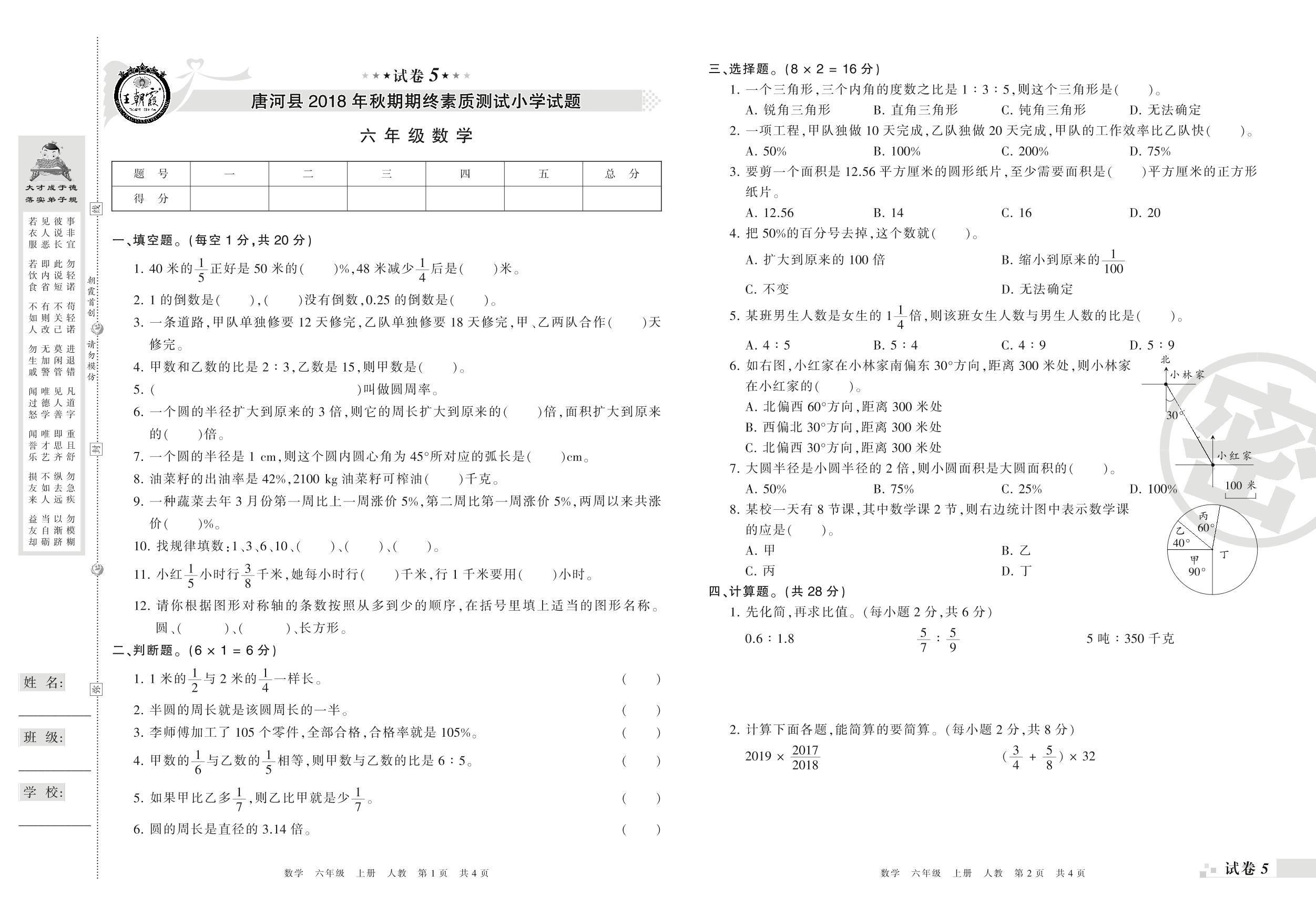 2018-2019学年第一学期南阳市唐河县六年级数学试卷(人教版)【5】