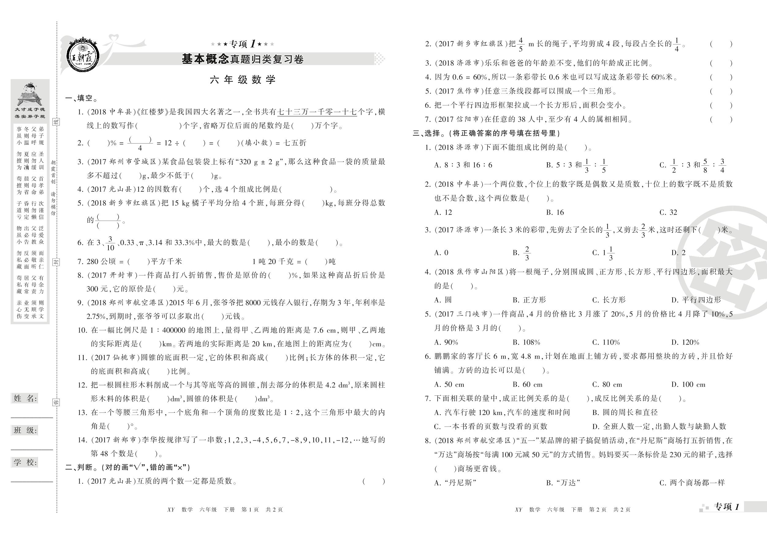 王朝霞期末专项卷——基本概念、计算真题归类复习卷六年级下册数学(人教版)_R210805100428【0】
