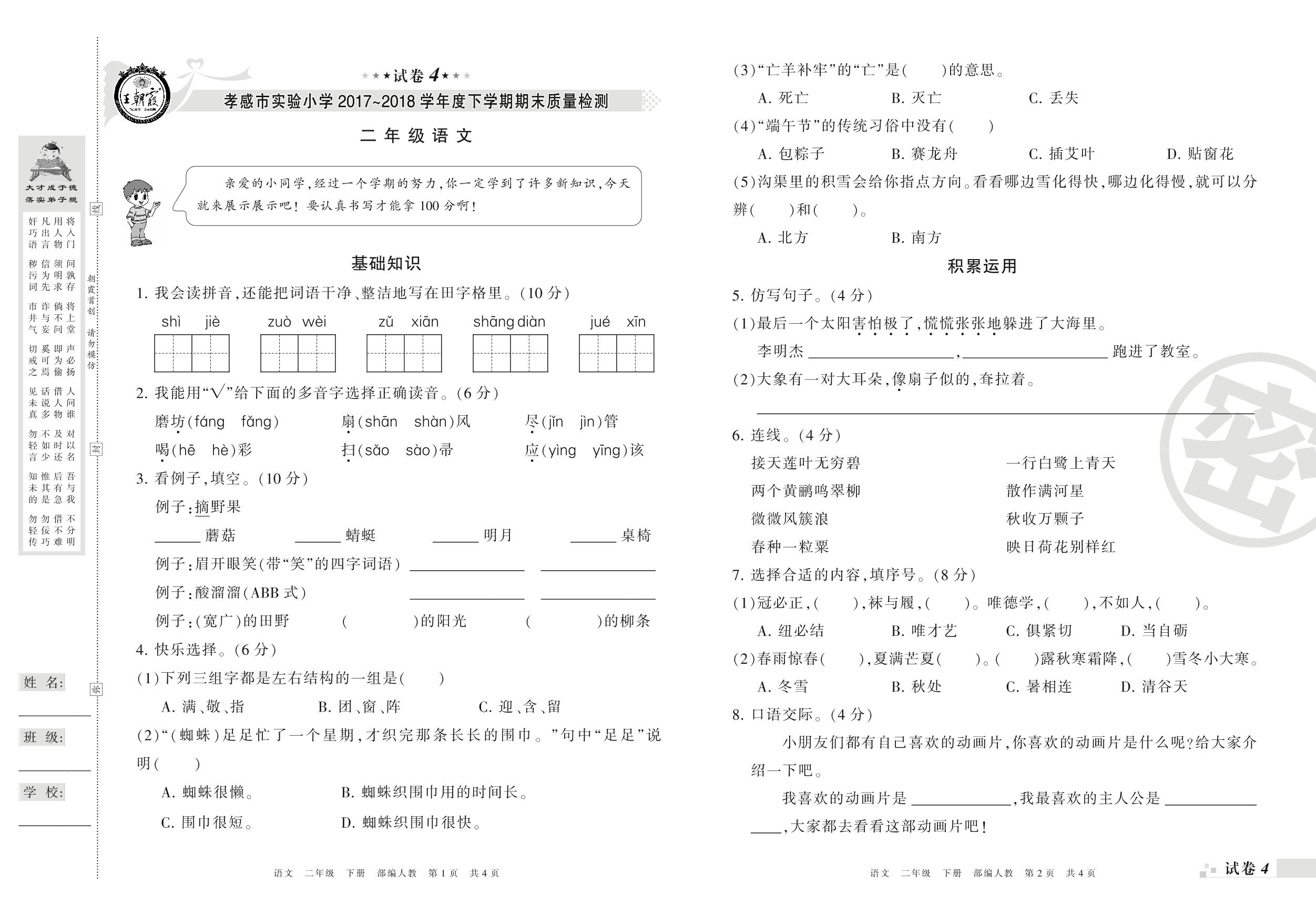 2017-2018学年第二学期孝感市实验小学二年级语文试卷(人教版)【4】