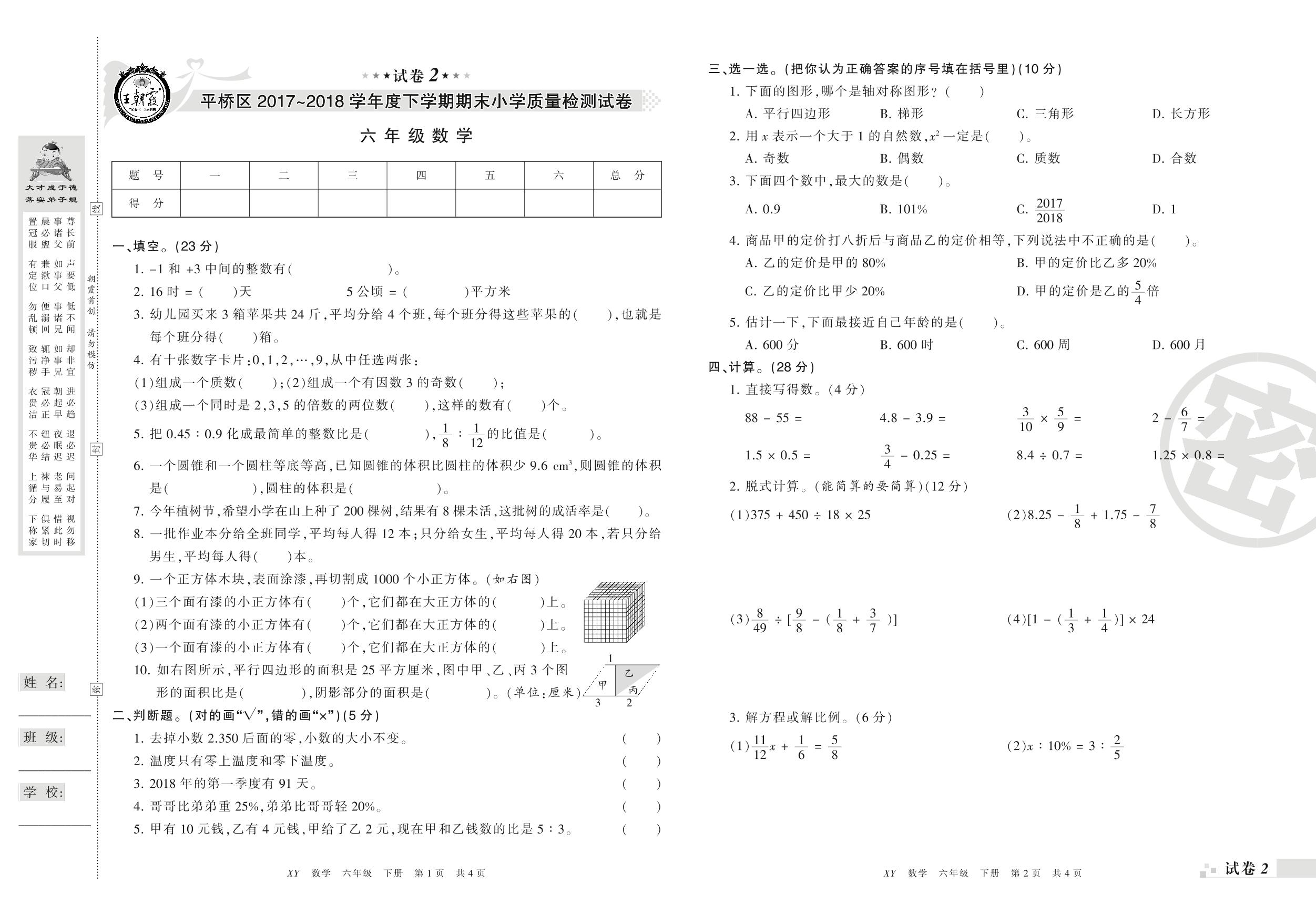 2017-2018学年第二学期信阳市平桥区六年级数学试卷(人教版)【2】