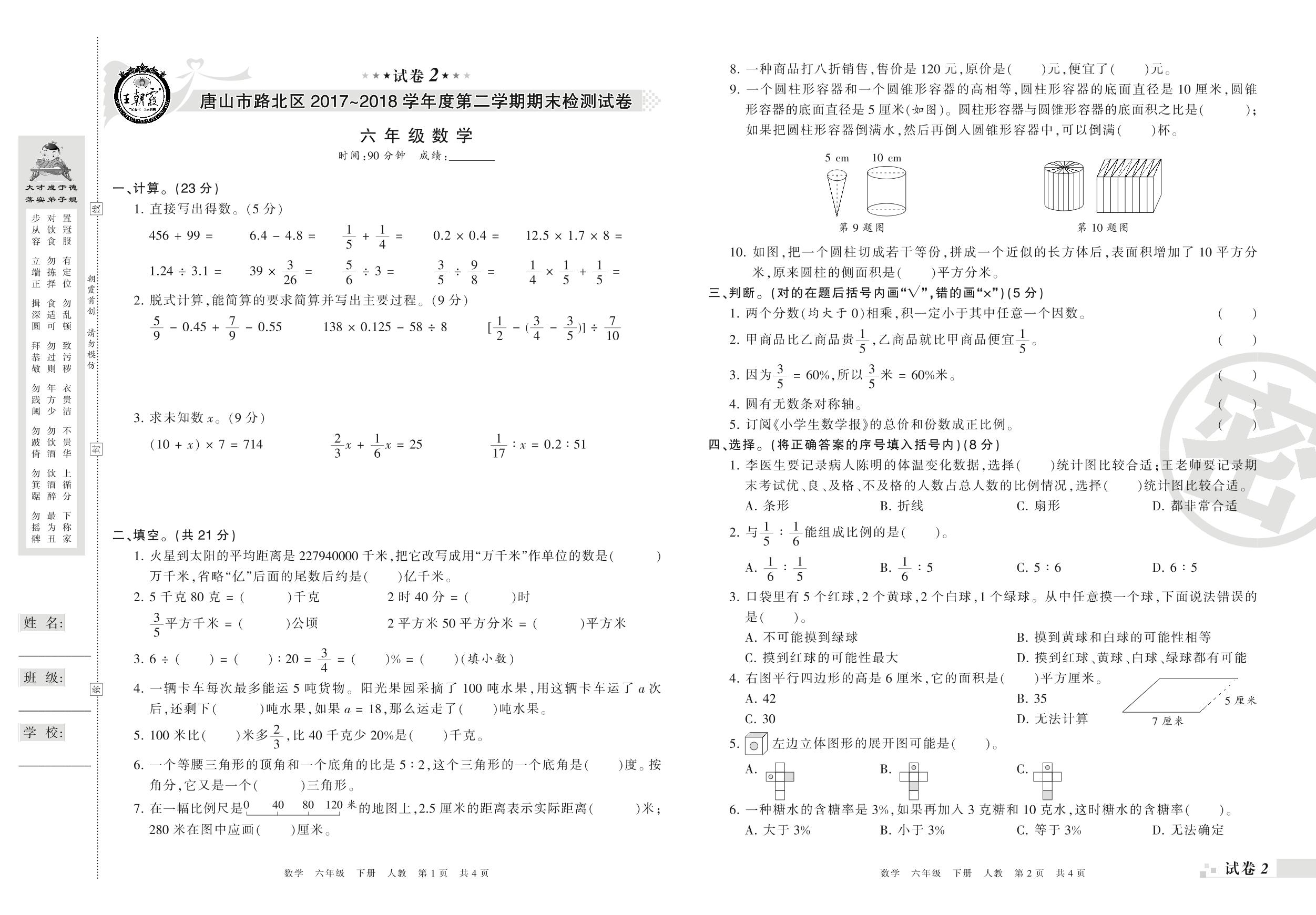 2017-2018学年第二学期唐山市路北区六年级数学试卷(人教版)【2】