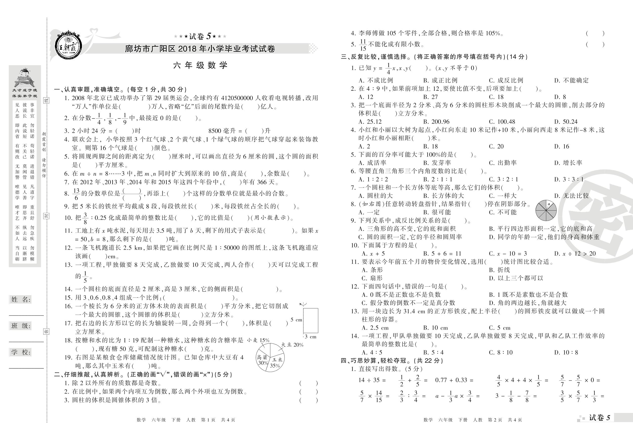 2017-2018学年第二学期廊坊市广阳区六年级数学试卷(人教版)【5】