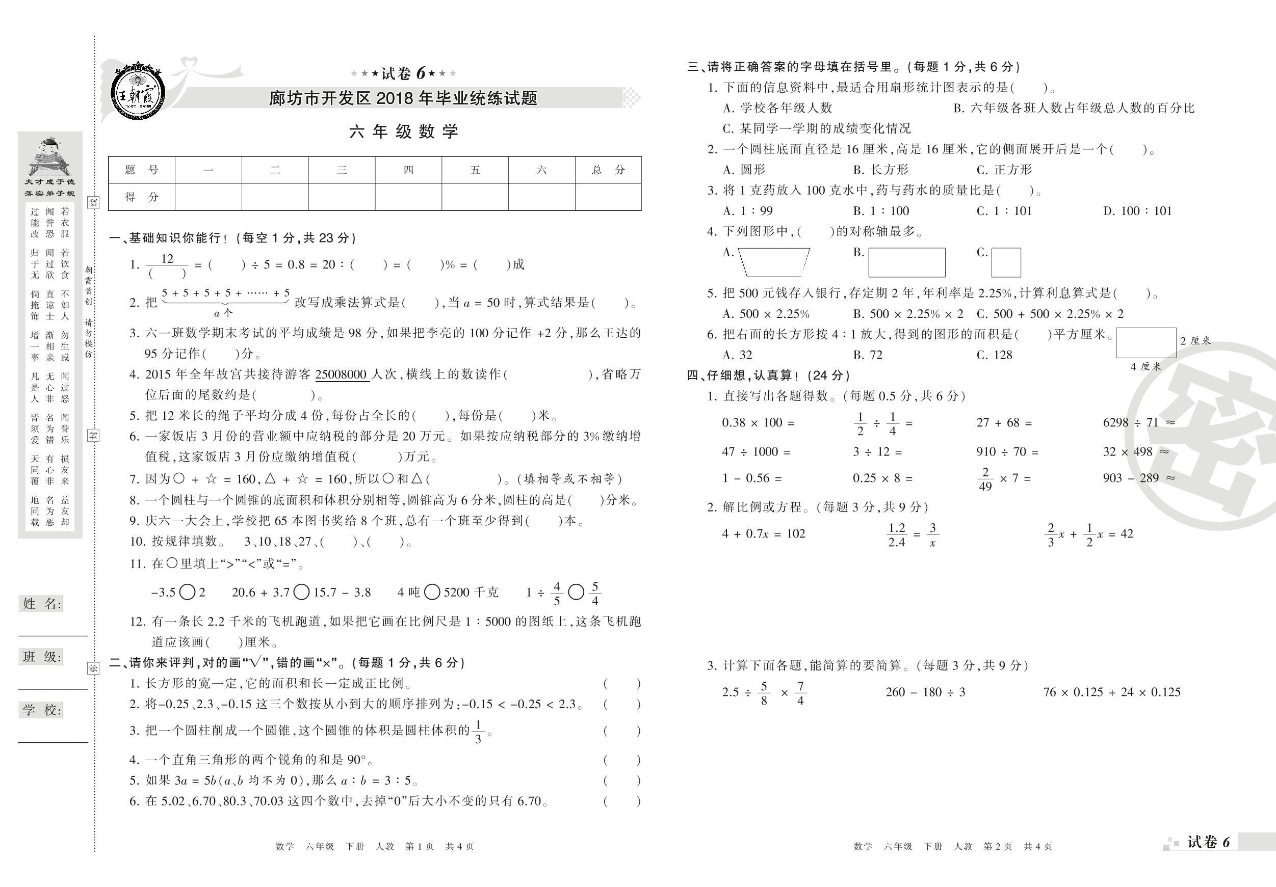 2017-2018学年第二学期廊坊市开发区六年级数学试卷(人教版)【6】