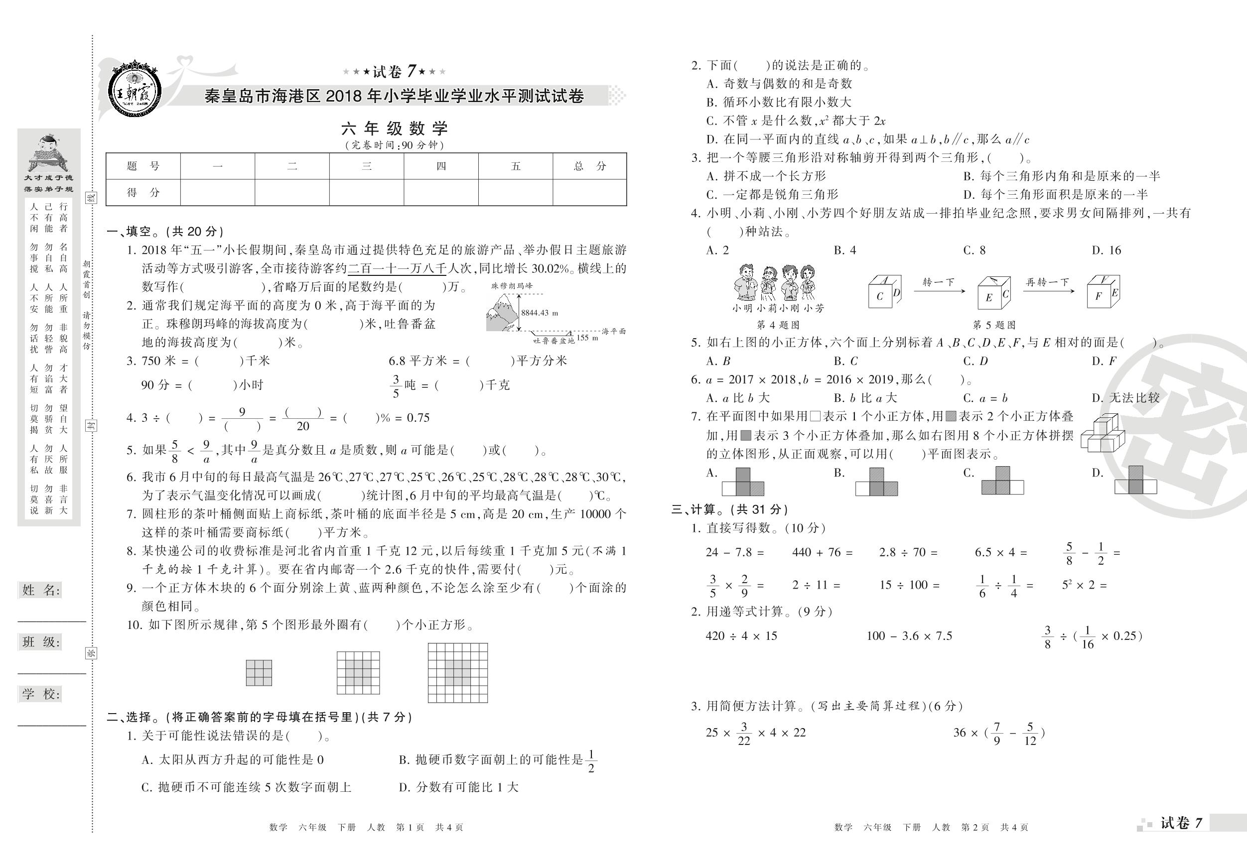 2017-2018学年第二学期秦皇岛市海港区六年级数学试卷(人教版)【7】