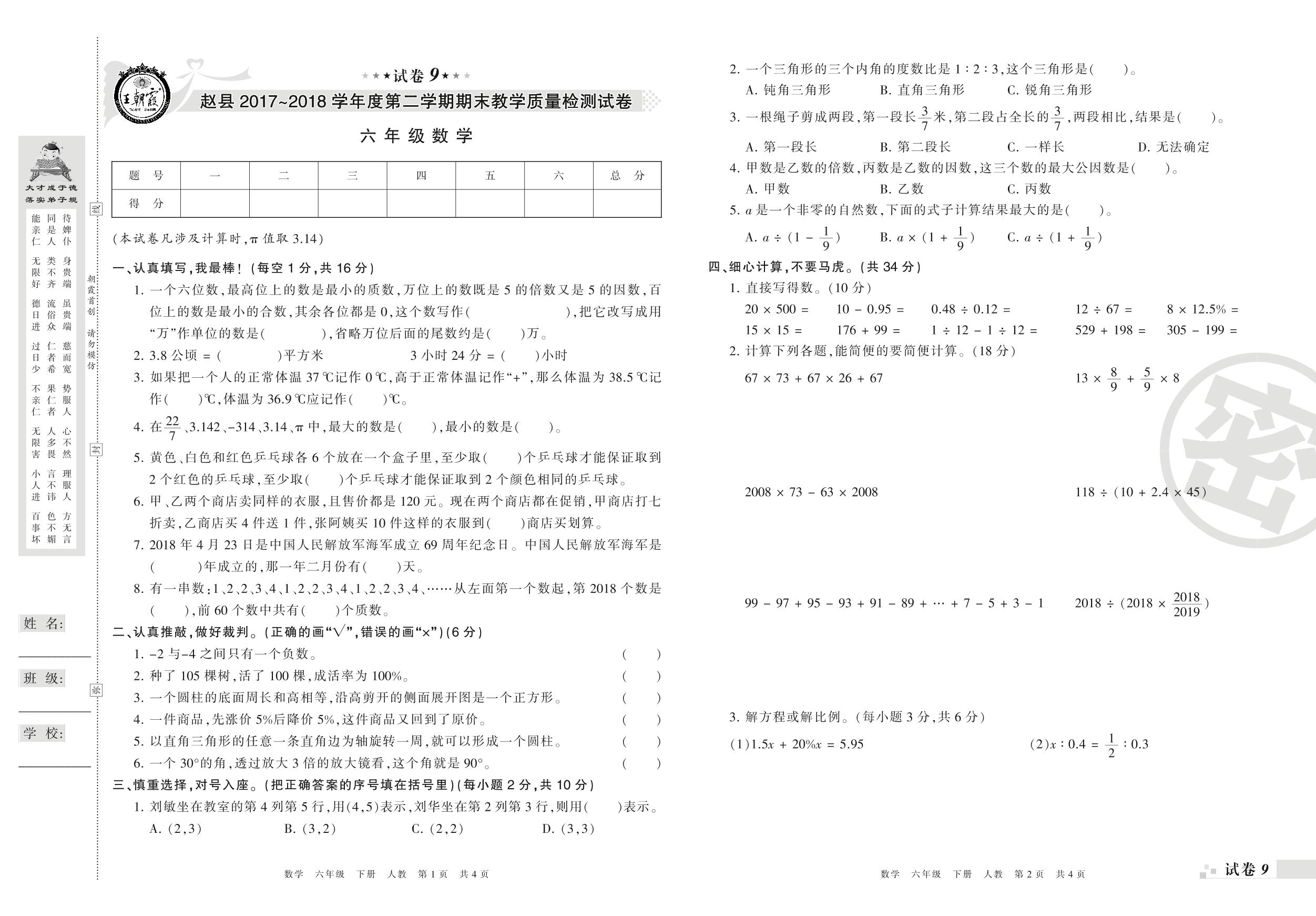 2017-2018学年第二学期石家庄市赵县六年级数学试卷(人教版)【9】