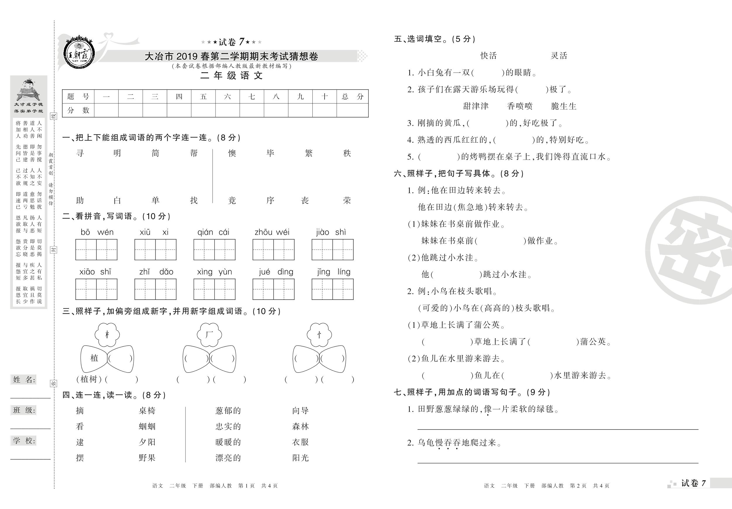 2017-2018学年第二学期大冶市二年级语文试卷(人教版)【7】