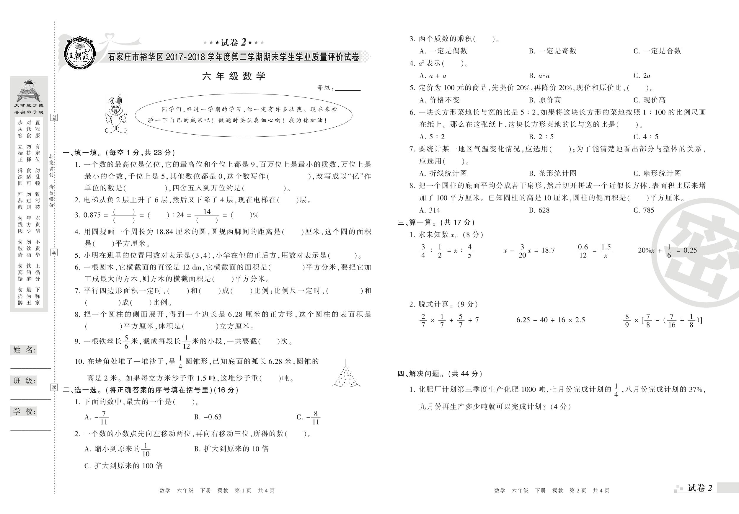 2017-2018学年第二学期石家庄市石家庄裕华区六年级数学试卷(冀教版)【2】
