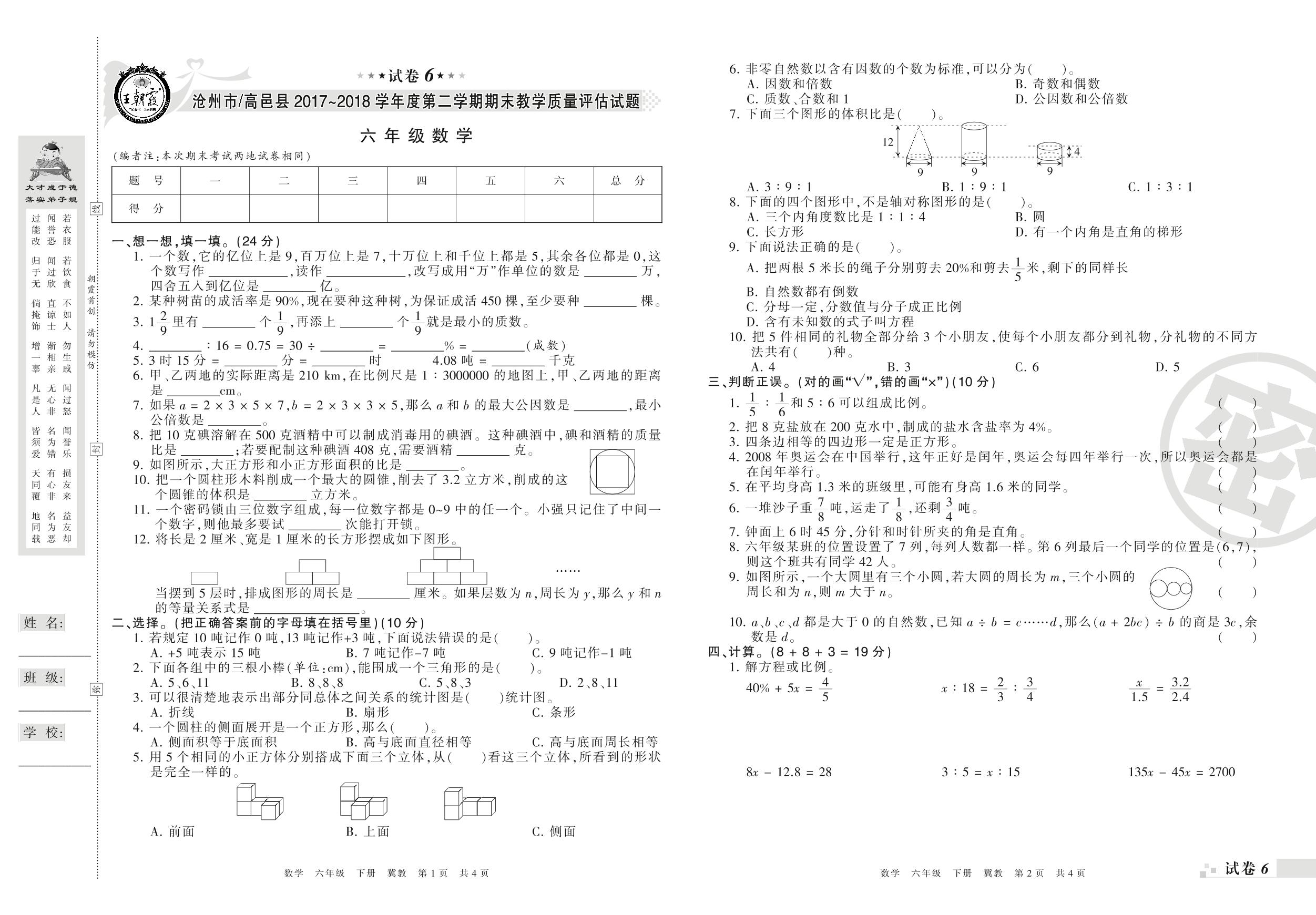 2017-2018学年第二学期沧州市、高邑县六年级数学试卷(冀教版)【6】