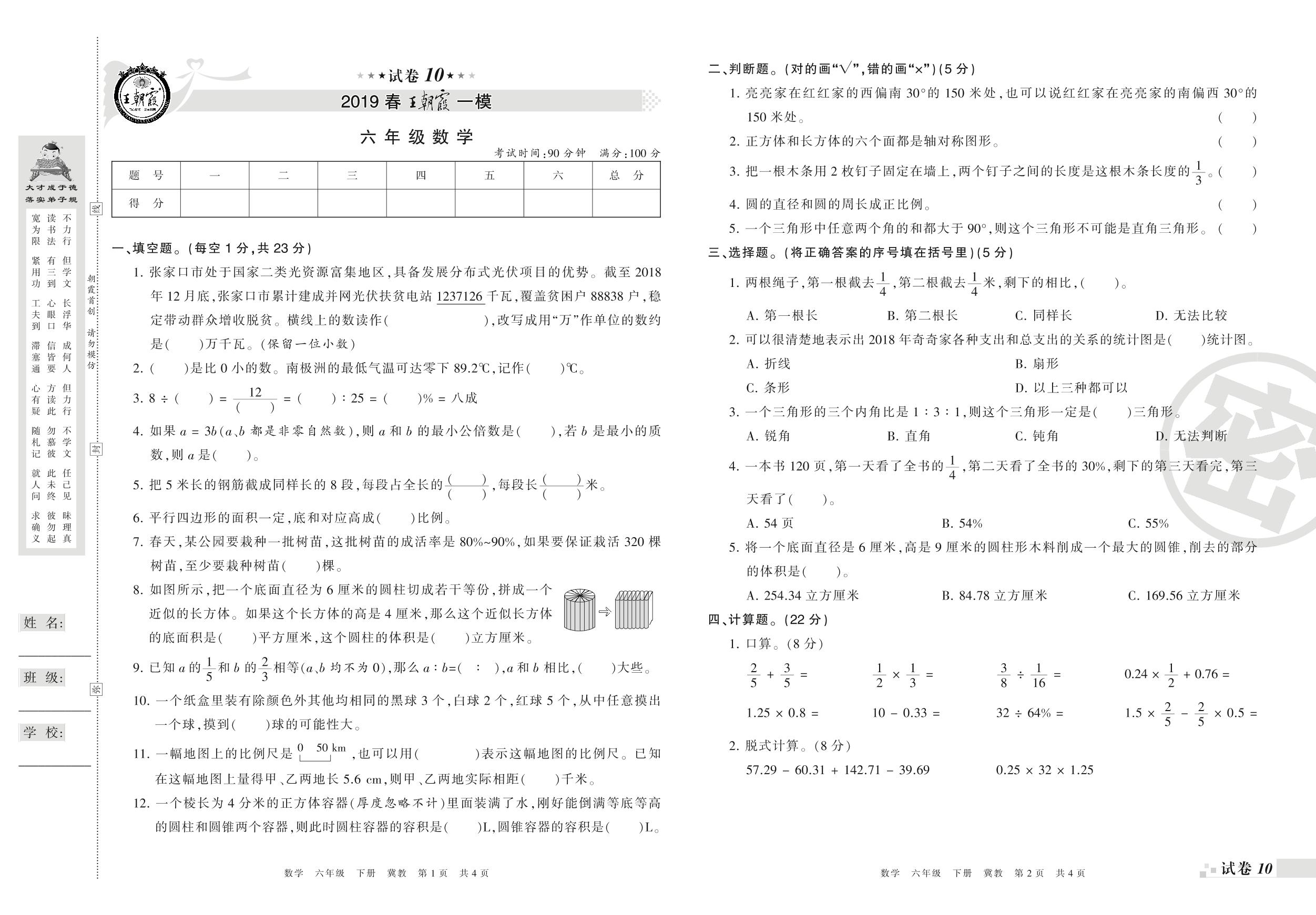 王朝霞期末模拟卷六年级下册数学(冀教版)_R210805100719【10】