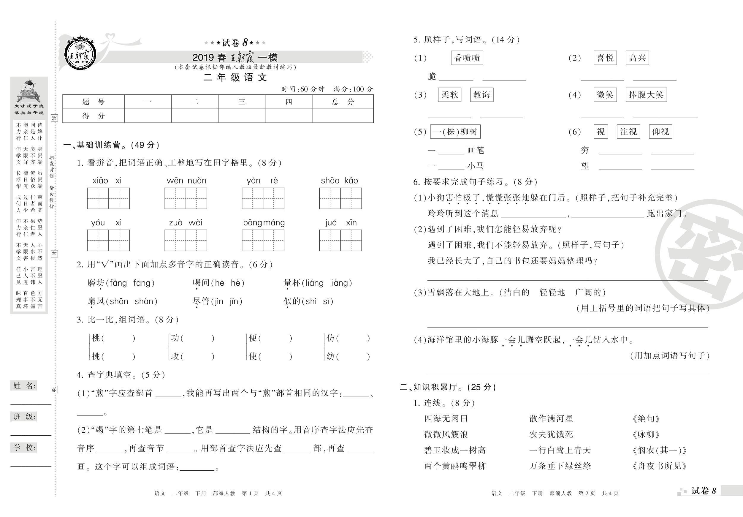 王朝霞期末模拟卷二年级下册语文(人教版)_R21080172538【8】