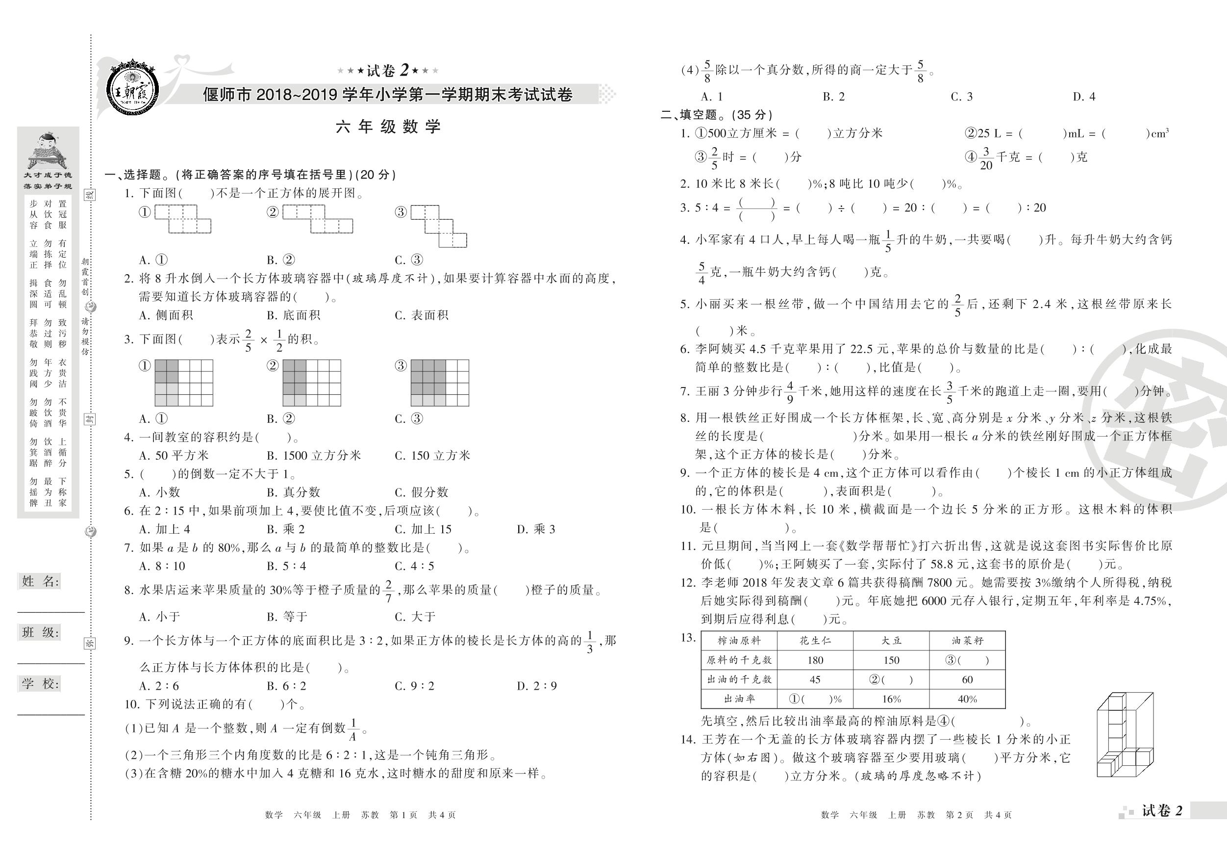 2018-2019学年第一学期偃师市六年级数学试卷(苏教版)【2】