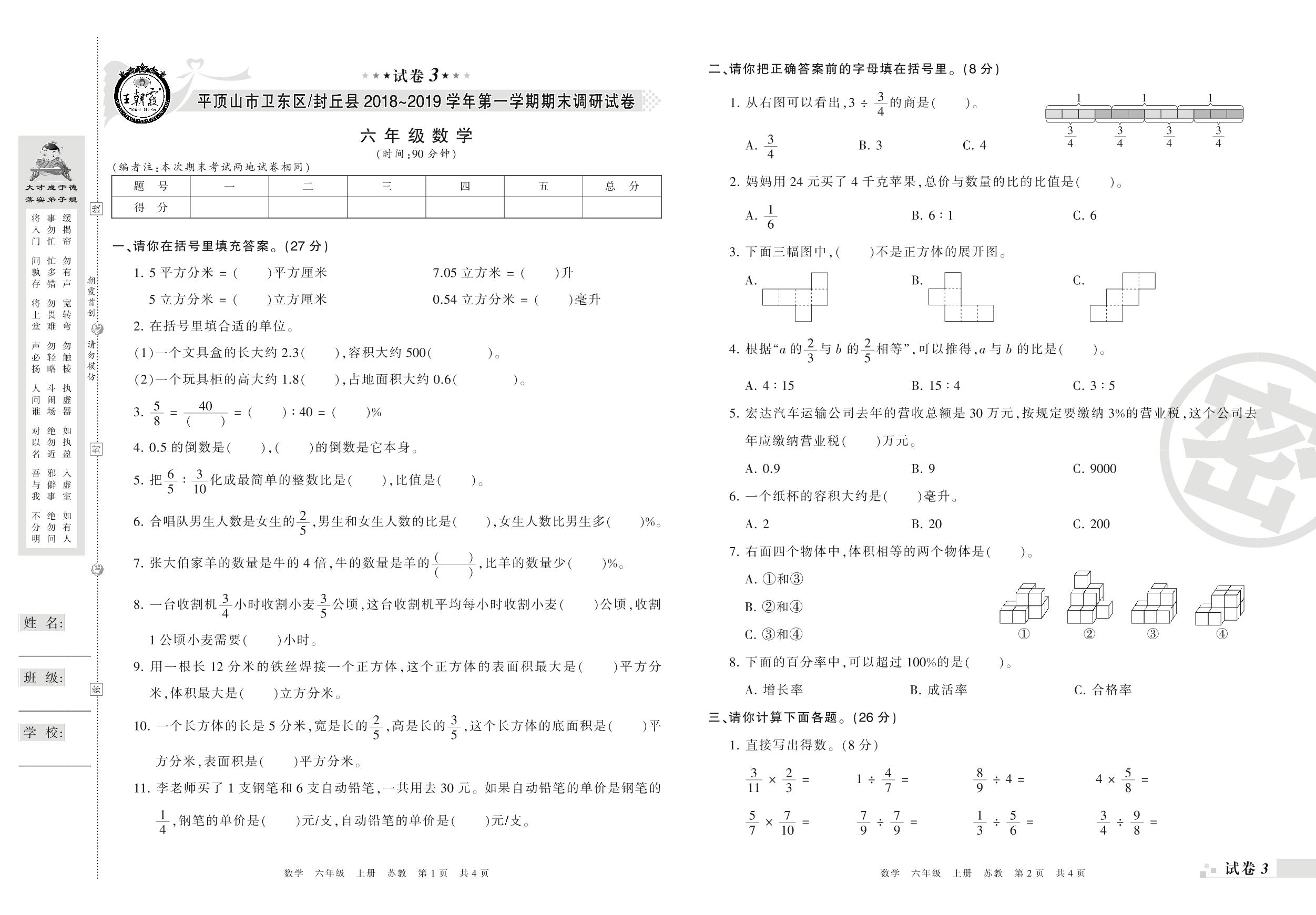 2018-2019学年第一学期平顶山市卫东区、封丘县六年级数学试卷(苏教版)【3】