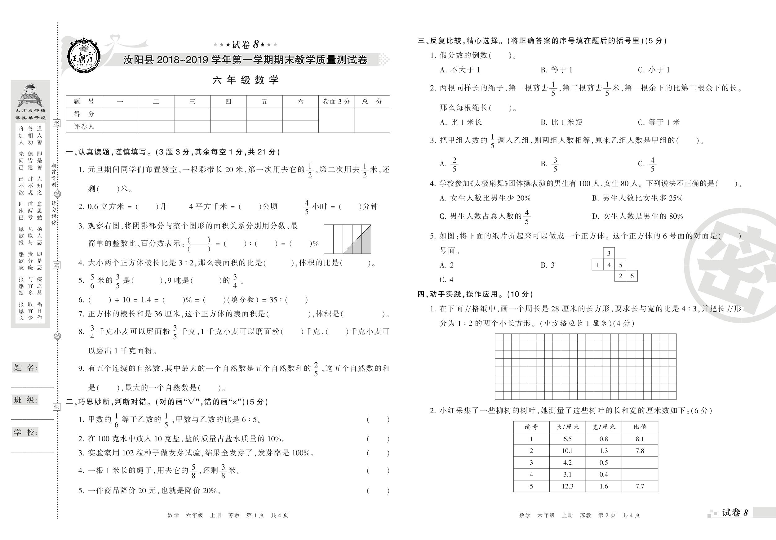 2018-2019学年第一学期洛阳市汝阳县六年级数学试卷(苏教版)【8】