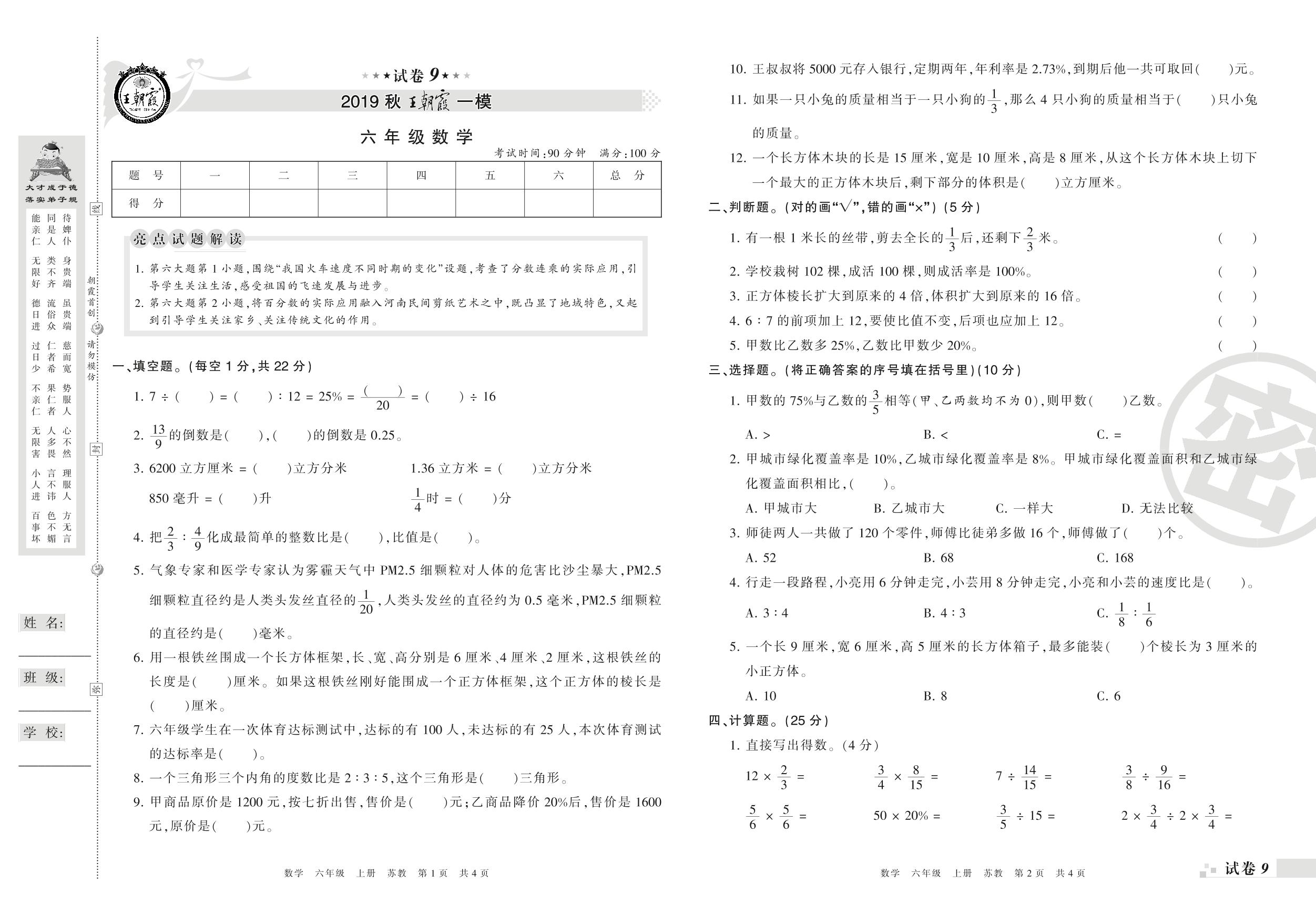 王朝霞期末模拟卷六年级上册数学(苏教版)_R210805100759【9】