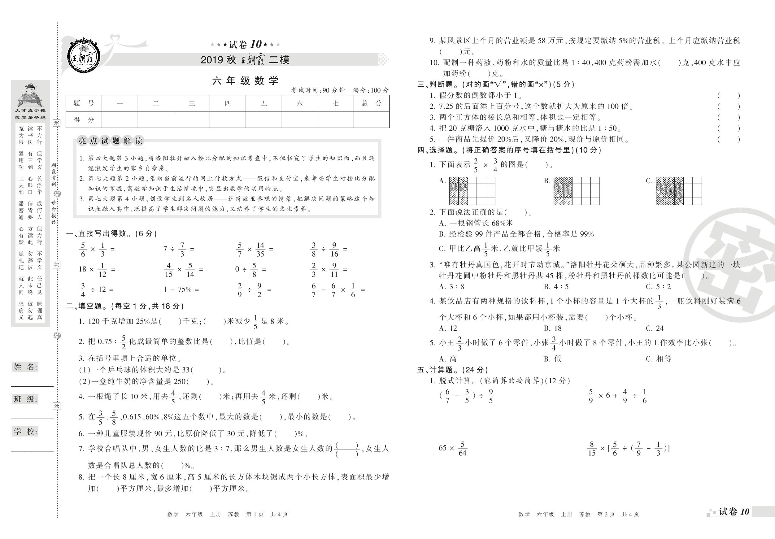 王朝霞期末模拟卷六年级上册数学(苏教版)_R210805100802【10】
