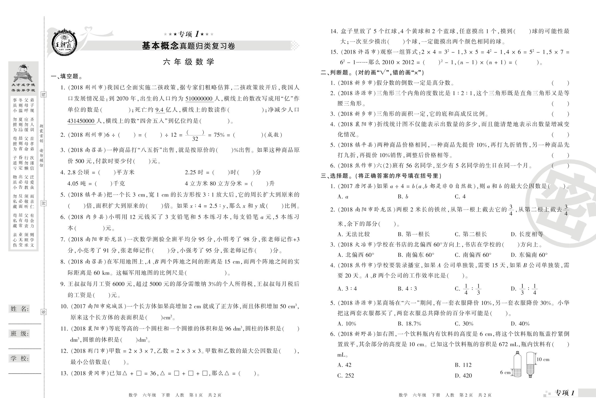 王朝霞期末专项卷——基本概念、计算真题归类复习卷六年级下册数学(人教版)_R210805100817【0】