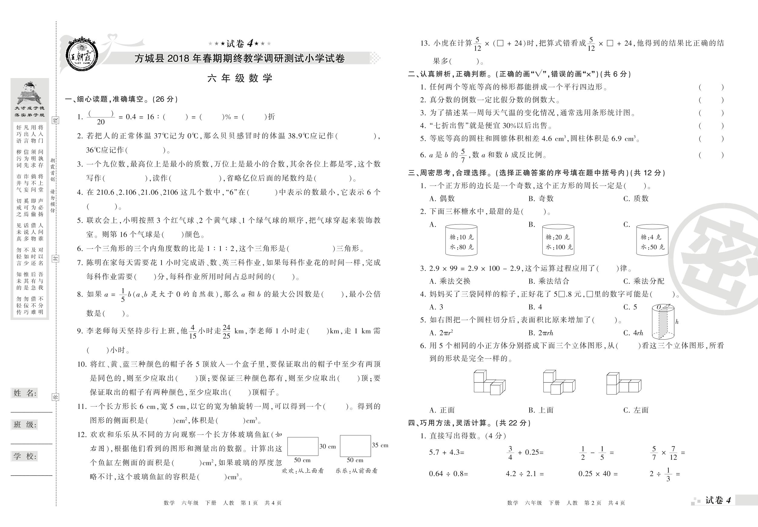2017-2018学年第二学期南阳市方城县六年级数学试卷(人教版)【4】