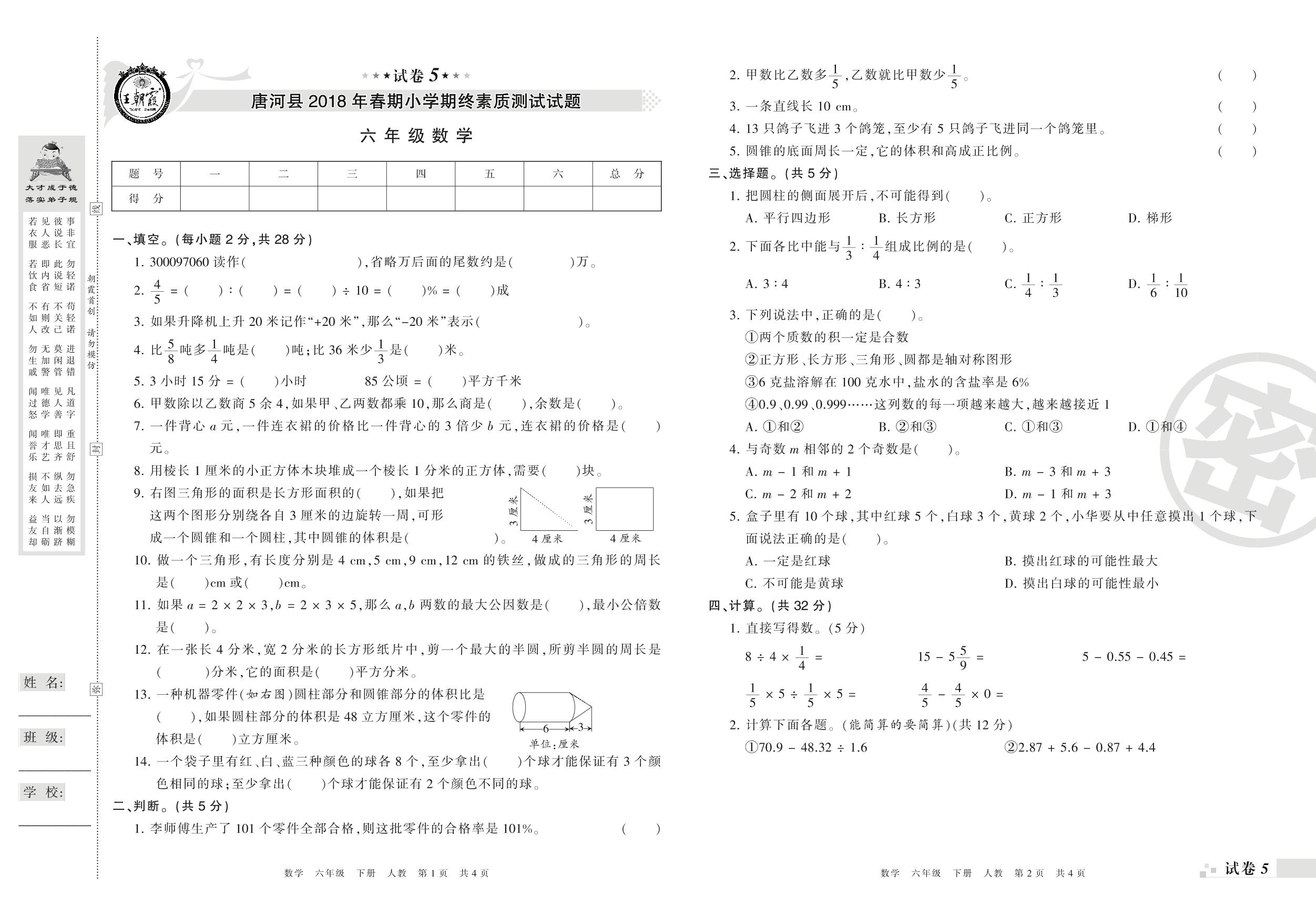 2017-2018学年第二学期南阳市唐河县六年级数学试卷(人教版)【5】