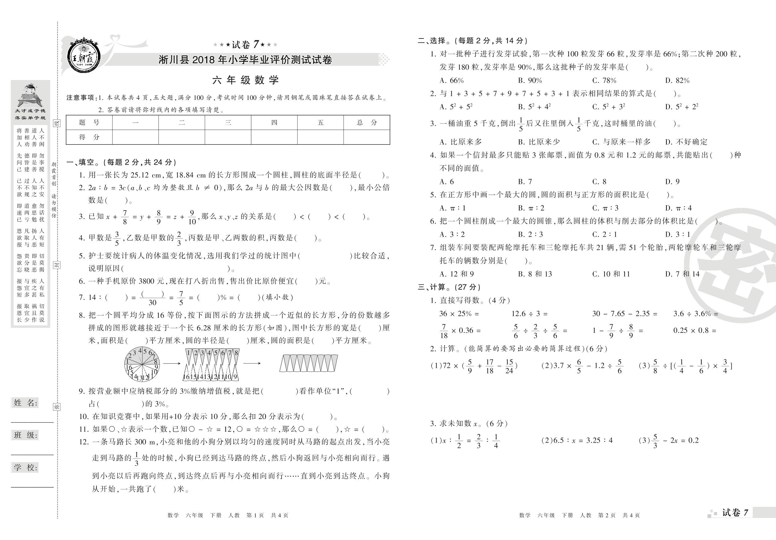 2017-2018学年第二学期南阳市淅川县六年级数学试卷(人教版)【7】