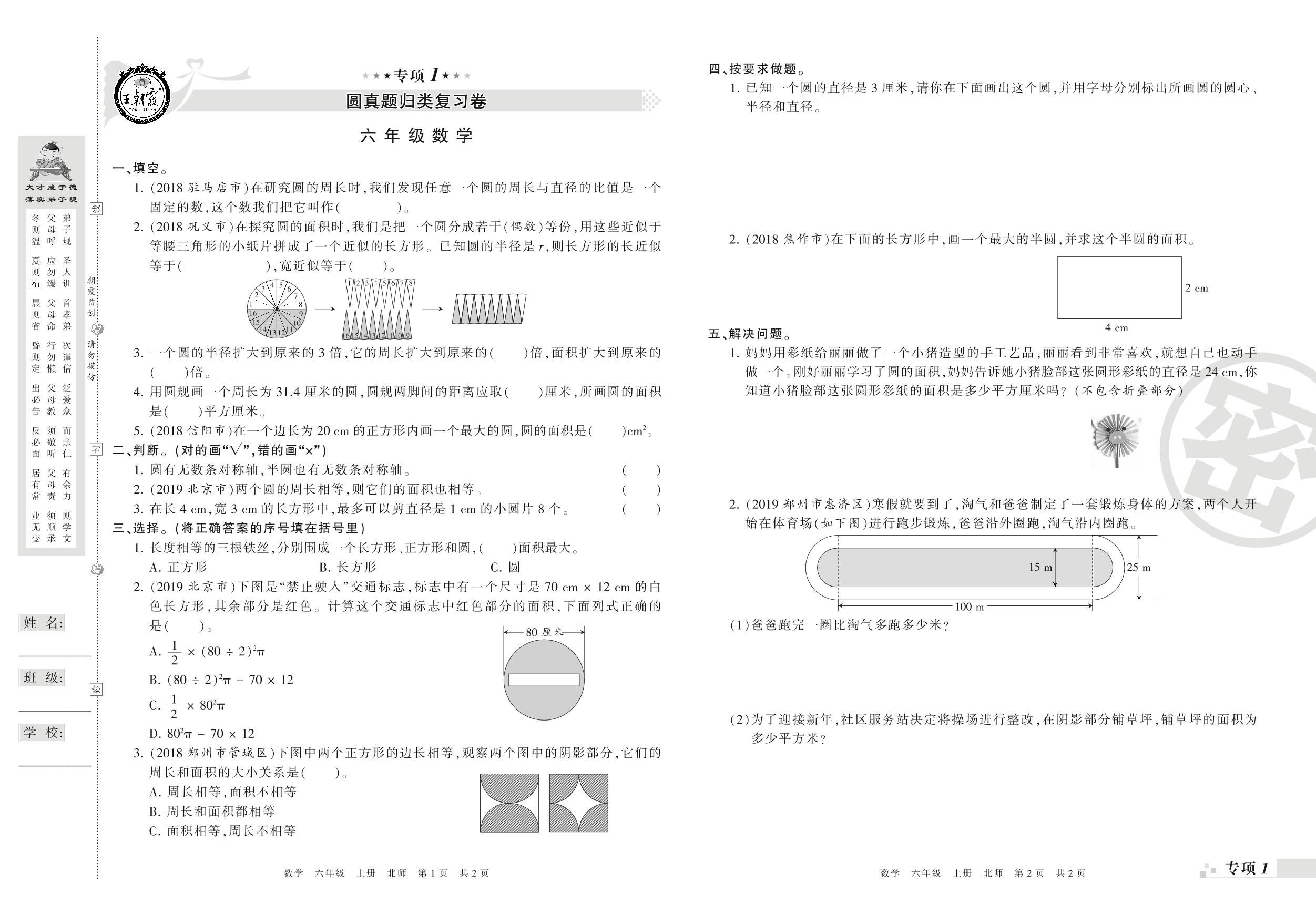 王朝霞期末专项卷——圆、分数混合运算真题归类复习六年级上册数学(北师版)_R210805100853【0】
