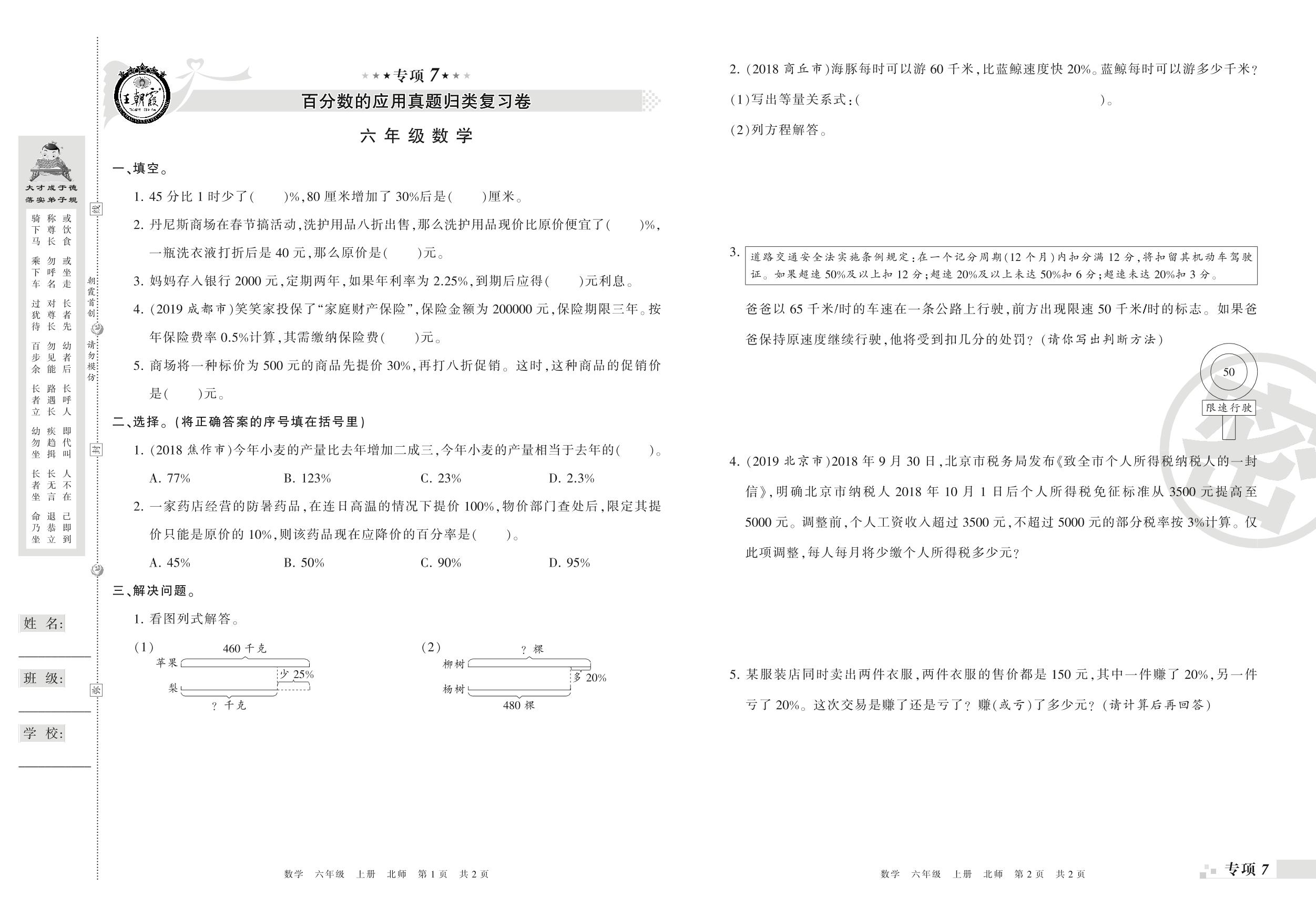 王朝霞期末专项卷——百分数的应用、观察物体及数学好玩真题归类复习六年级上册数学(北师版)_R210805100900【0】