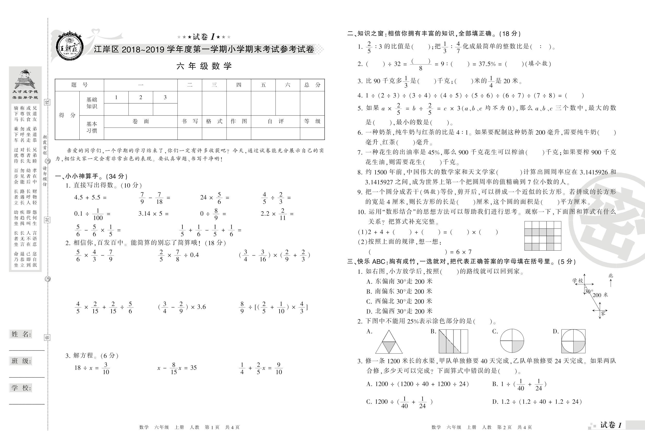 2018-2019学年第一学期武汉市江岸区六年级数学试卷(人教版)【1】