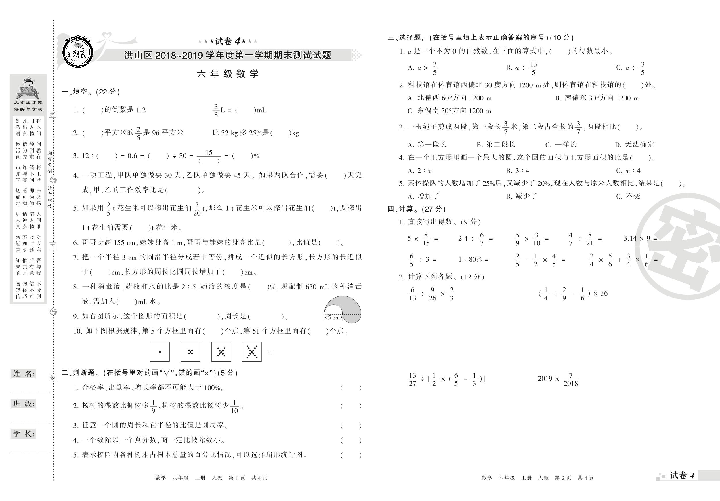 2018-2019学年第一学期武汉市洪山区六年级数学试卷(人教版)【4】