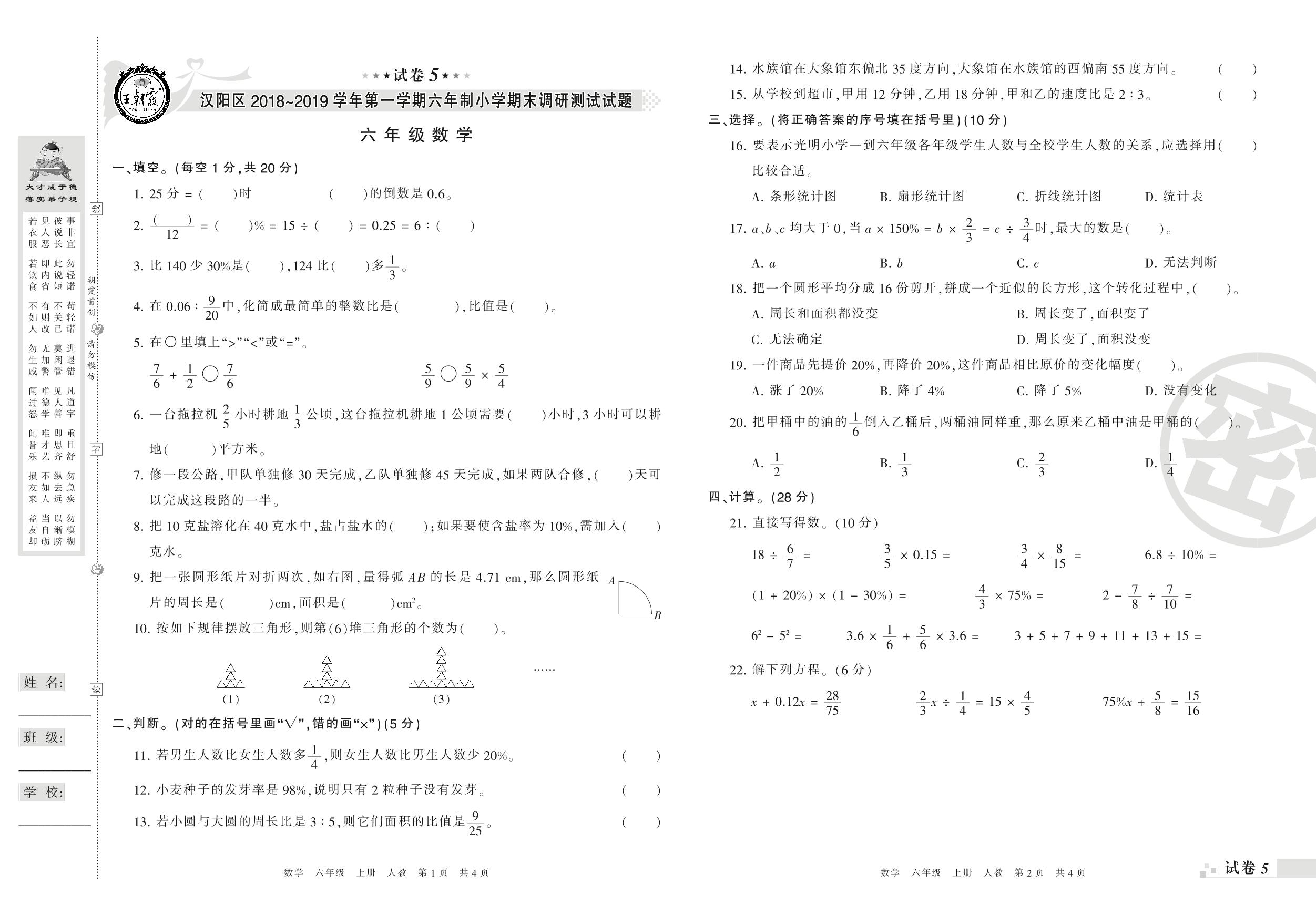 2018-2019学年第一学期武汉市汉阳区六年级数学试卷(人教版)【5】