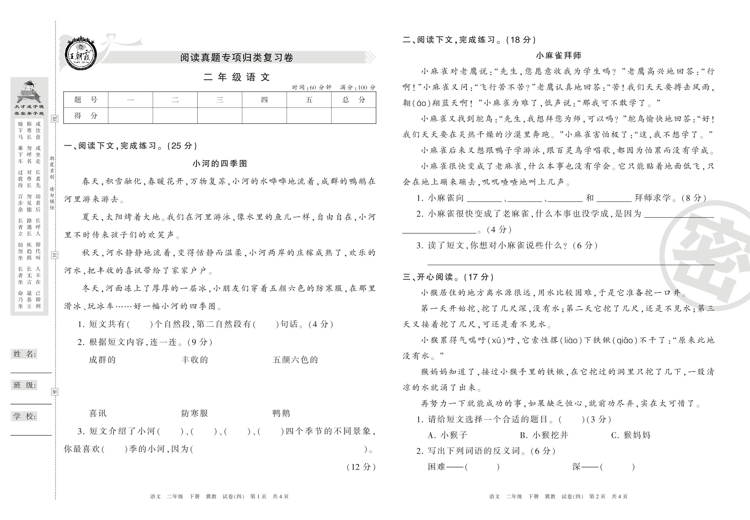 王朝霞期末专项卷二年级下册语文(冀教版)_R21080172558【4】