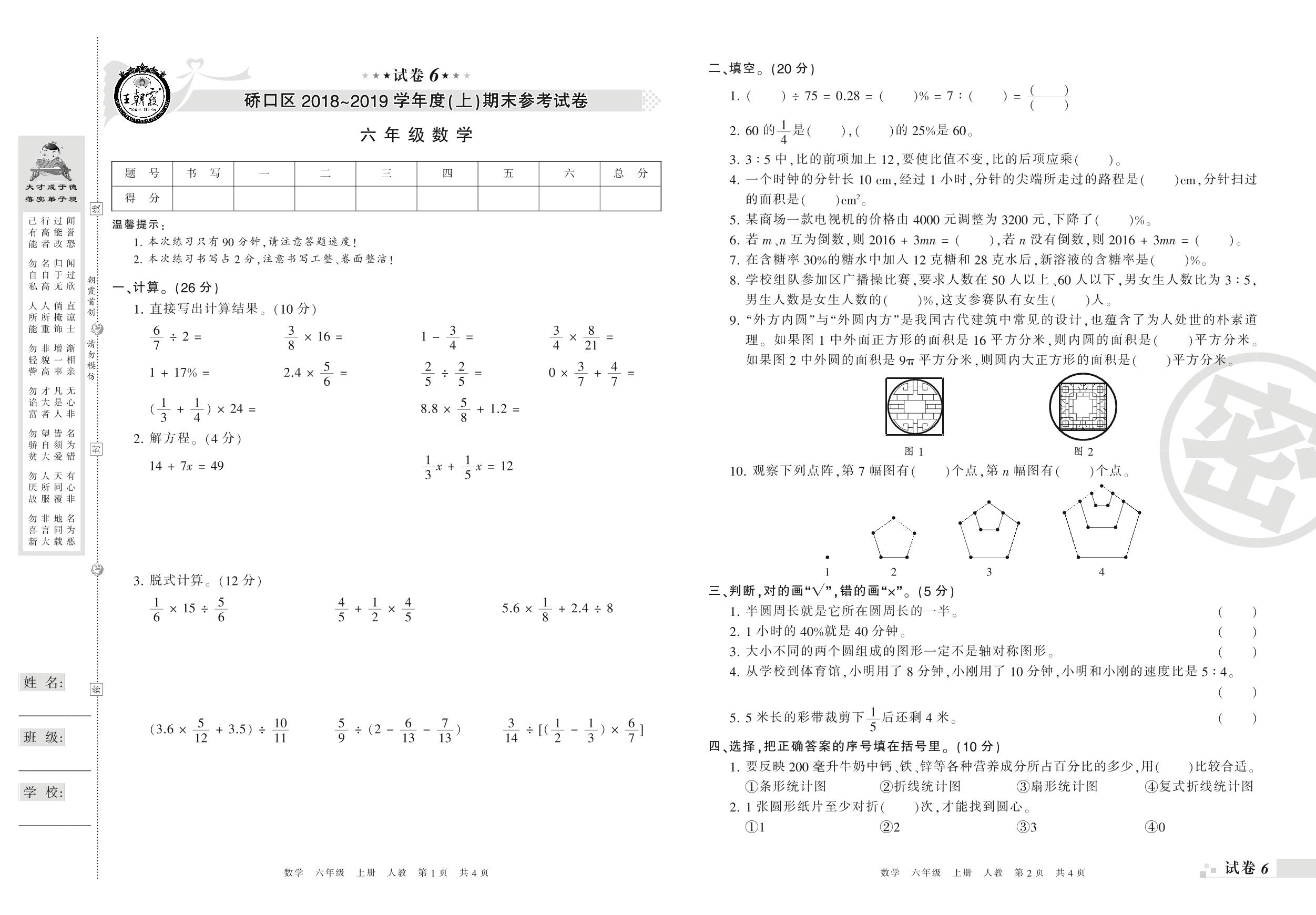 2018-2019学年第一学期硚口区六年级数学试卷(人教版)【6】
