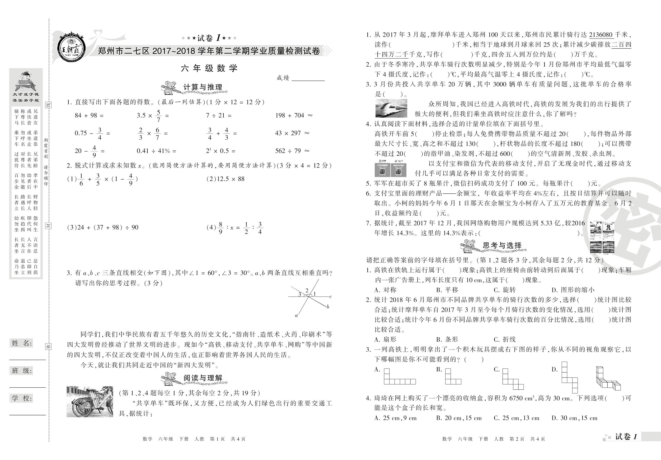 2017-2018学年第二学期郑州市二七区六年级数学试卷(人教版)【1】
