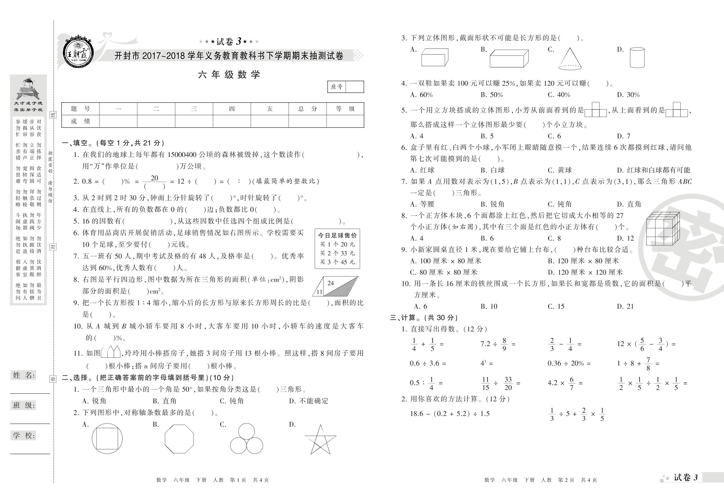 2017-2018学年第二学期开封市六年级数学试卷(人教版)【3】
