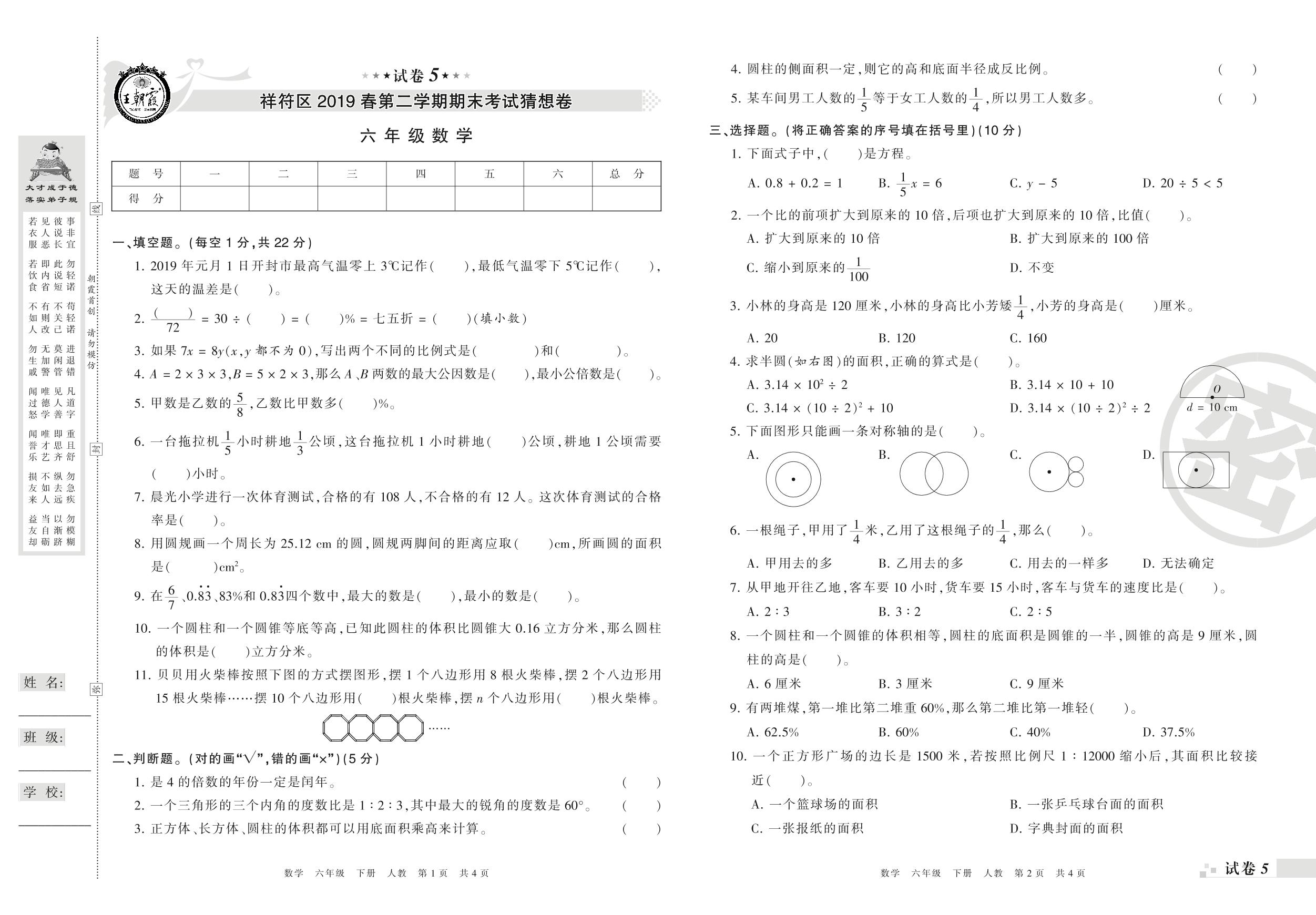 2018-2019学年第二学期开封市祥符区猜想卷六年级数学试卷(人教版)【5】