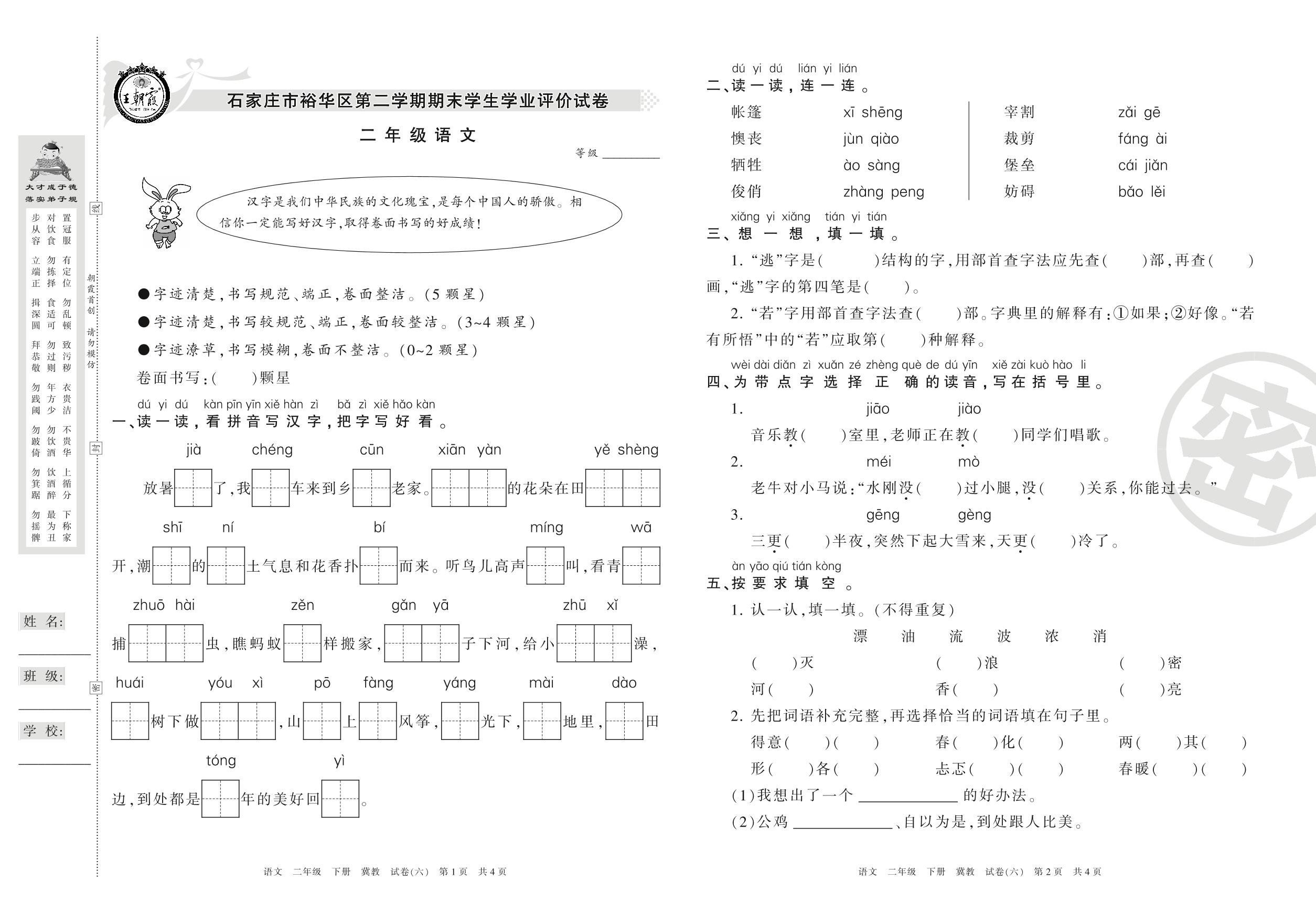 2015-2016学年第二学期石家庄市裕华区二年级语文试卷(冀教版)【6】