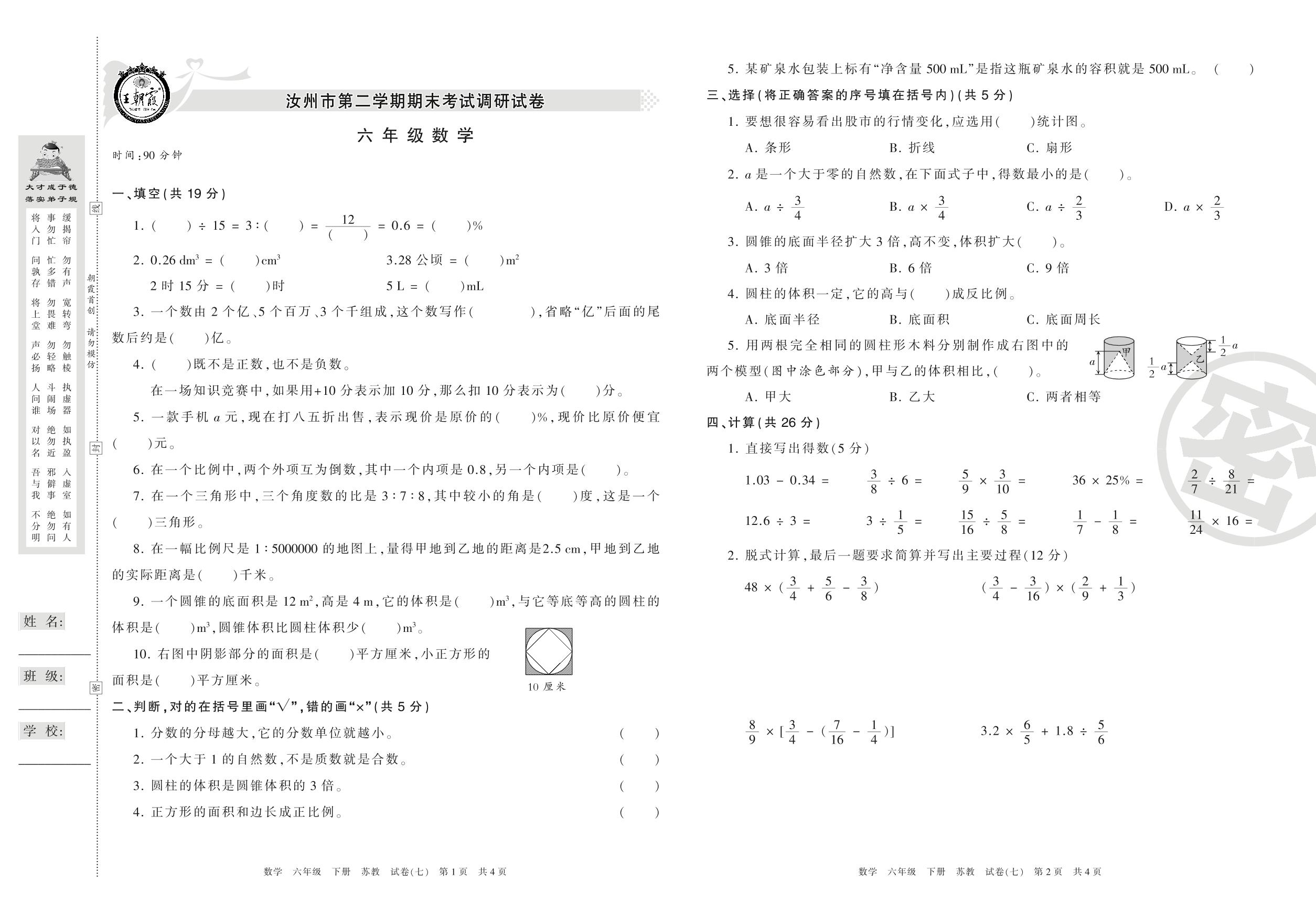 六年级数学苏教版下册期末卷