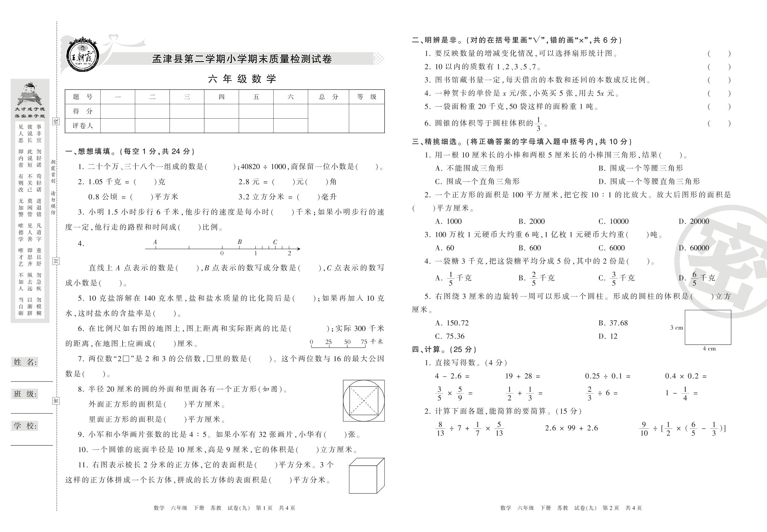 2015-2016学年第二学期洛阳市孟津县六年级数学试卷(苏教版)【9】