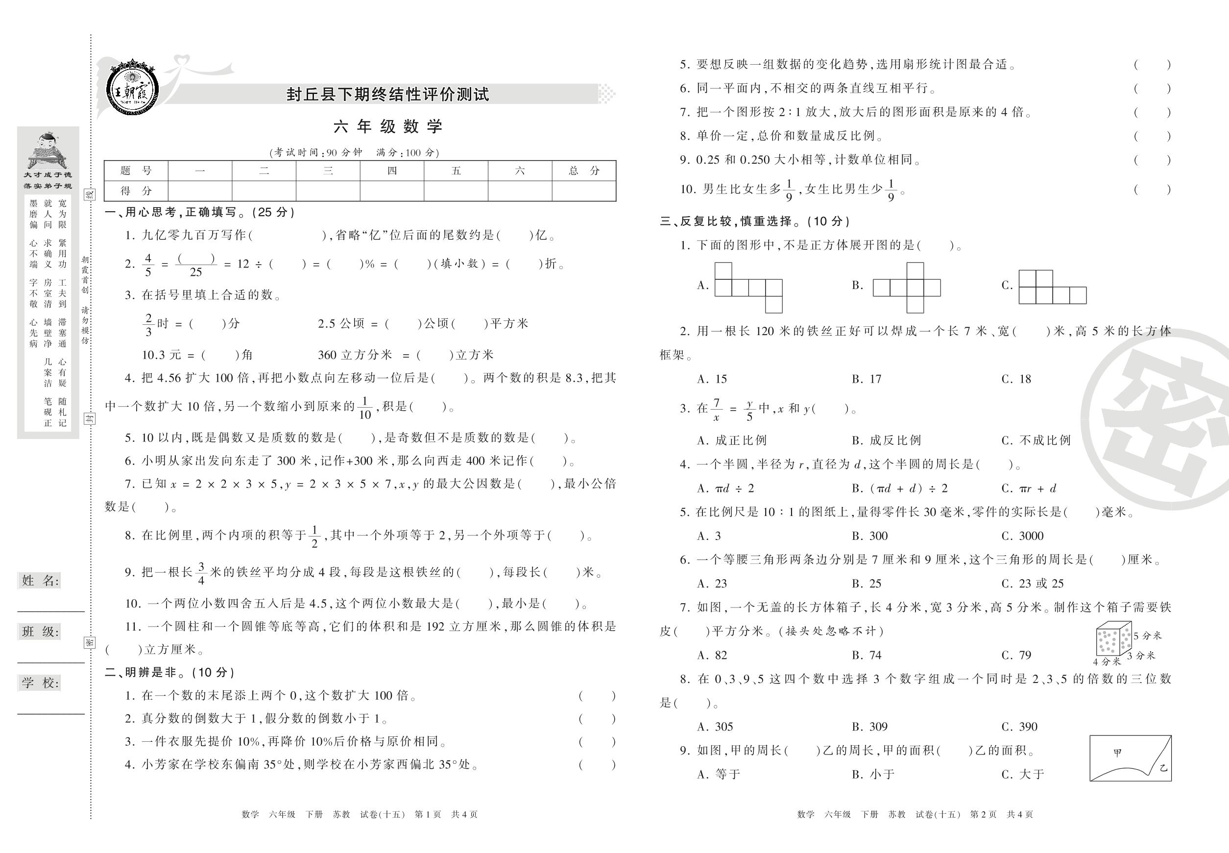 六年级数学苏教版下册期末卷