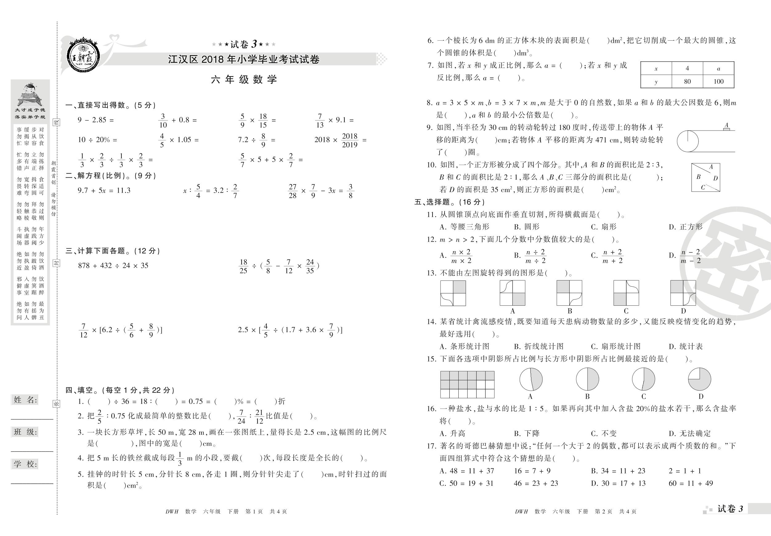 2017-2018学年第二学期武汉市江汉区六年级数学试卷(人教版)【3】