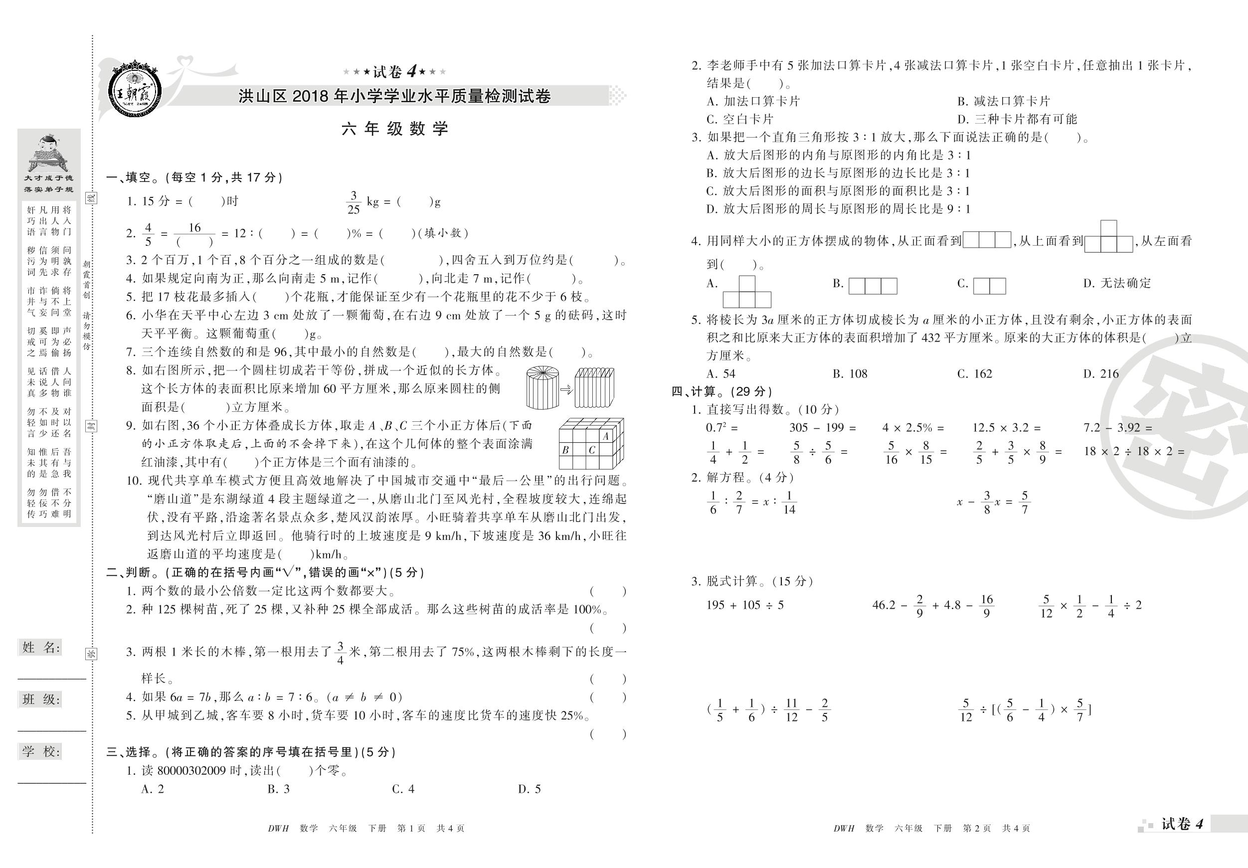 2017-2018学年第二学期武汉市洪山区六年级数学试卷(人教版)【4】