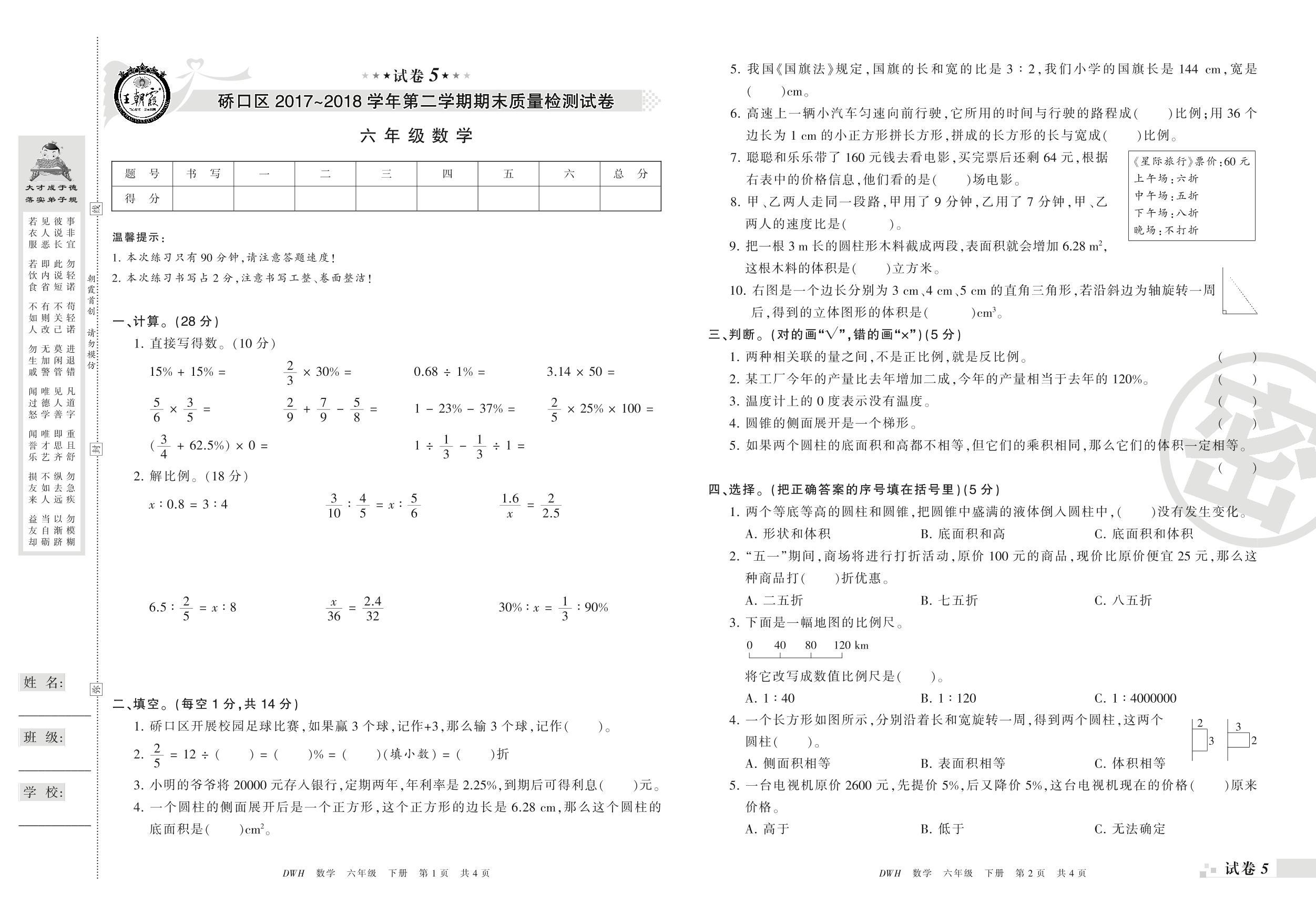 2017-2018学年第二学期武汉市硚口区六年级数学试卷(人教版)【5】