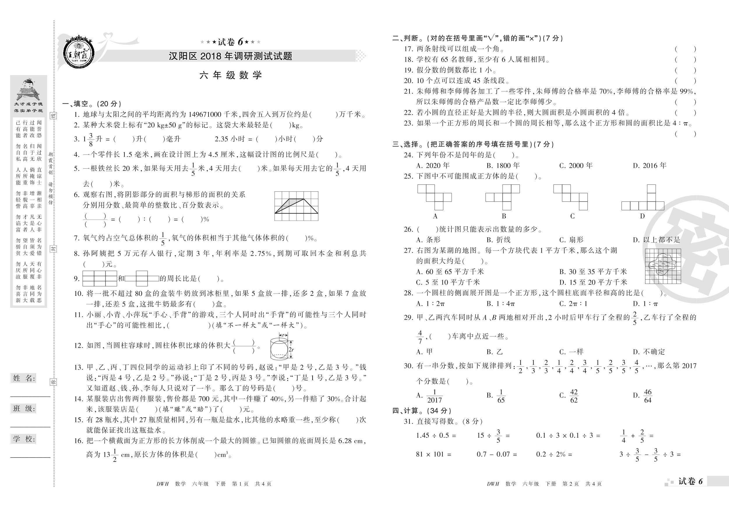 2017-2018学年第二学期武汉市汉阳区六年级数学试卷(人教版)【6】