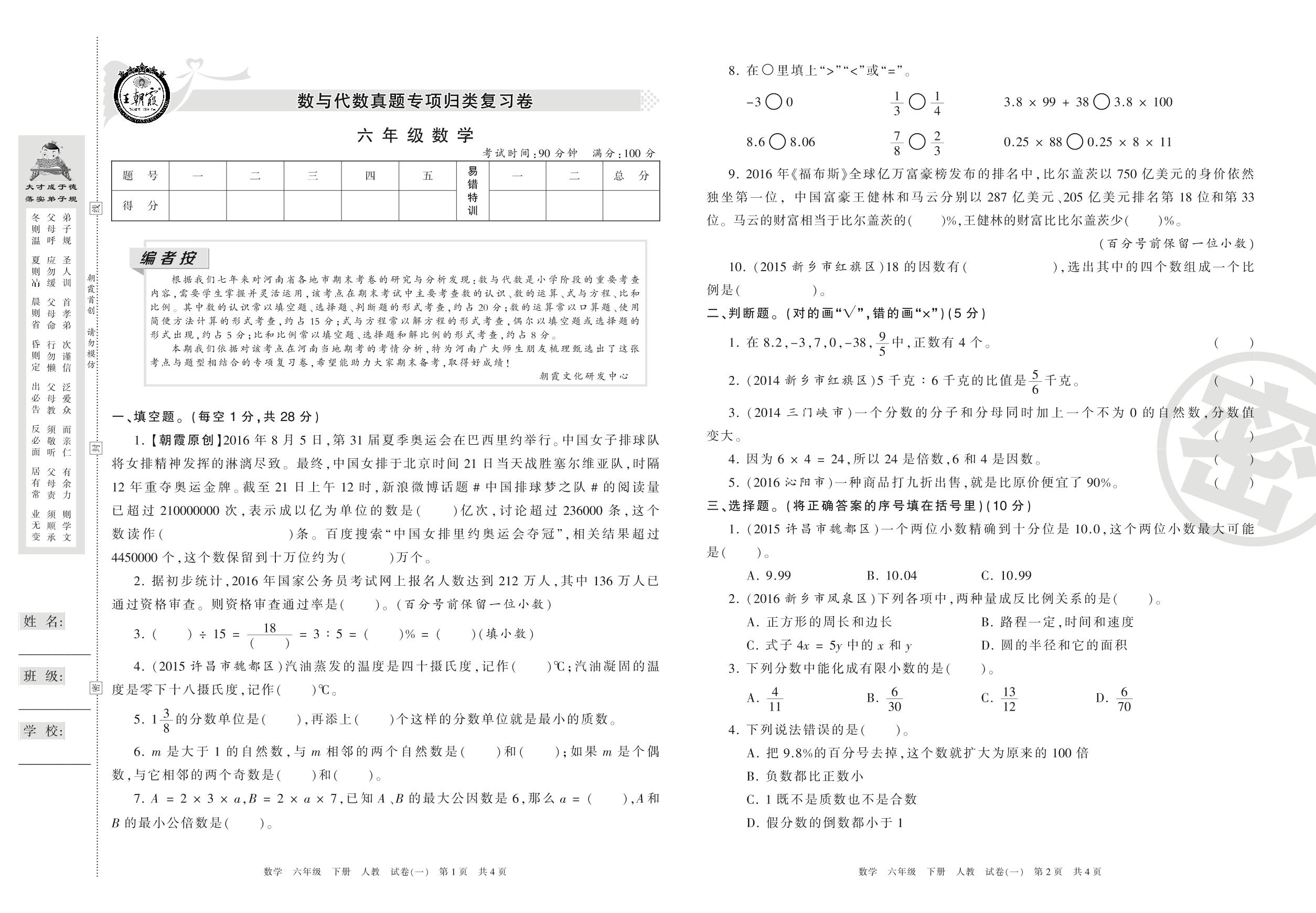 王朝霞期末专项卷六年级下册数学(人教版)_R210805101253【1】