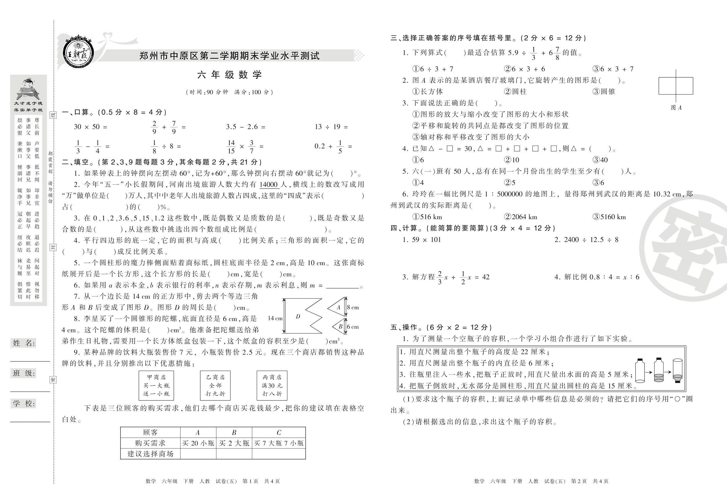 2015-2016学年第二学期郑州市中原区六年级数学试卷(人教版)【5】