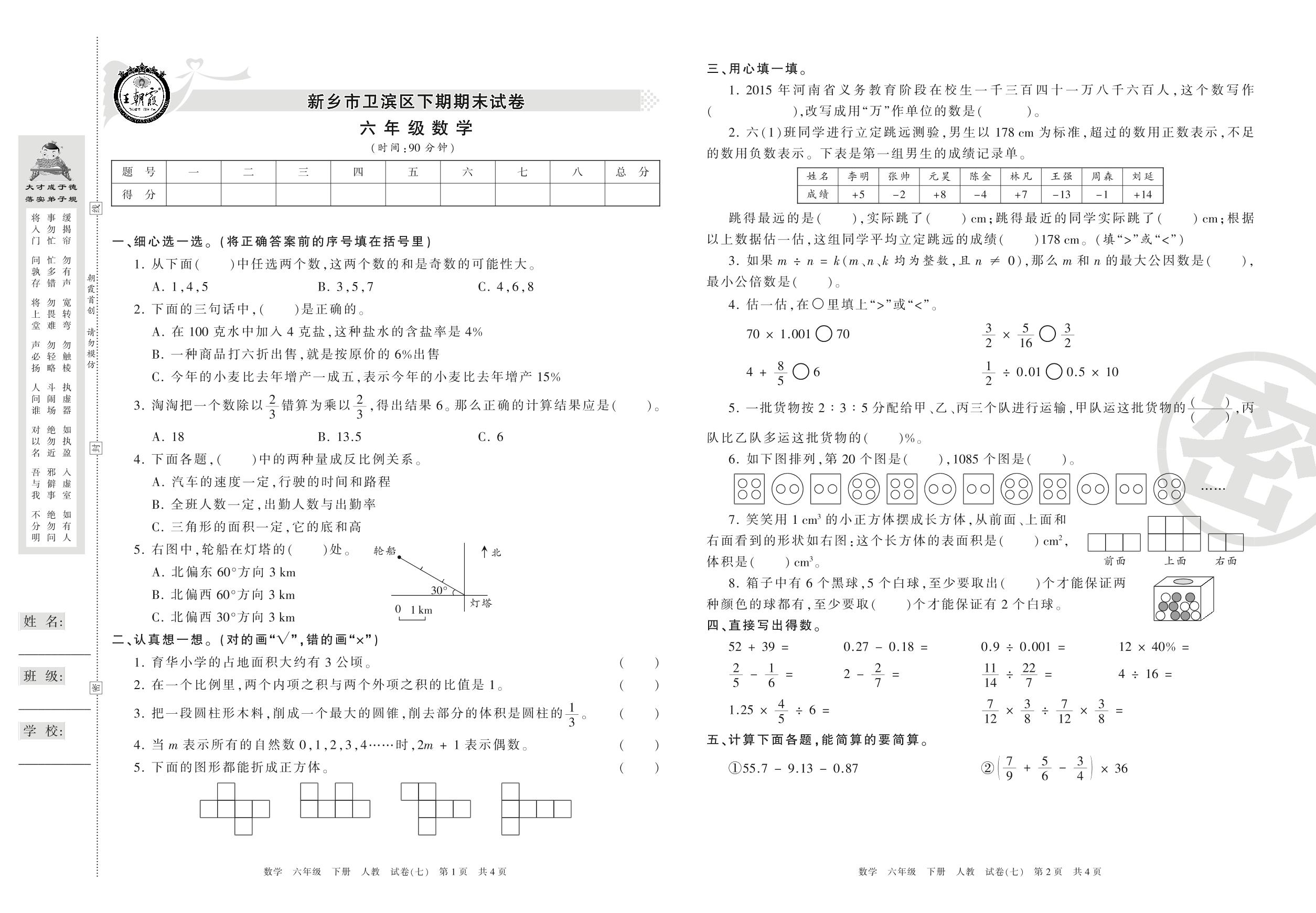 2015-2016学年第二学期新乡市卫滨区六年级数学试卷(人教版)【7】