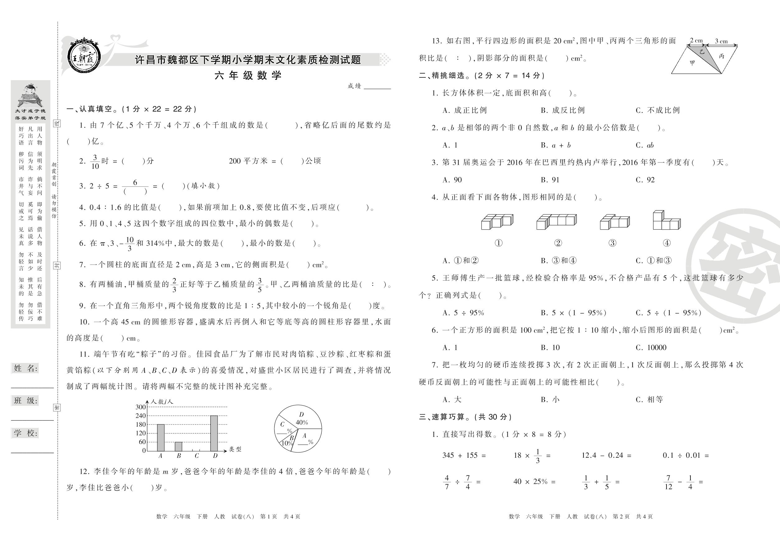 2015-2016学年第二学期许昌市魏都区六年级数学试卷(人教版)【8】