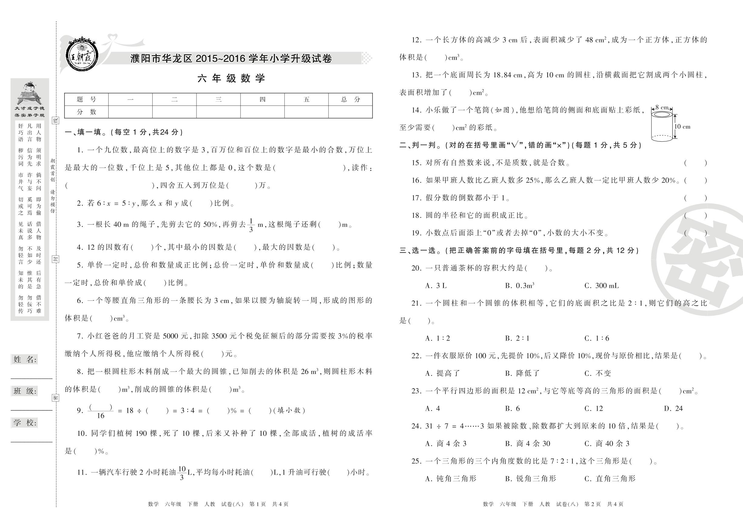 2015-2016学年第二学期濮阳市华龙区六年级数学试卷(人教版)【8】
