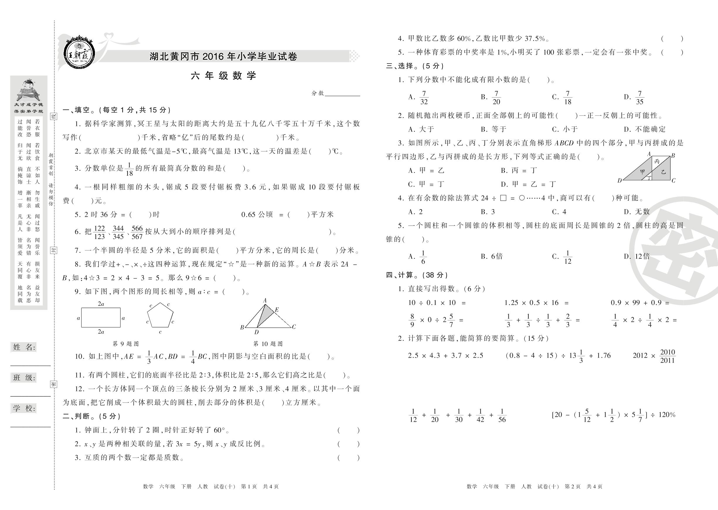 2015-2016学年第二学期湖北黄冈市六年级数学试卷(人教版)【10】