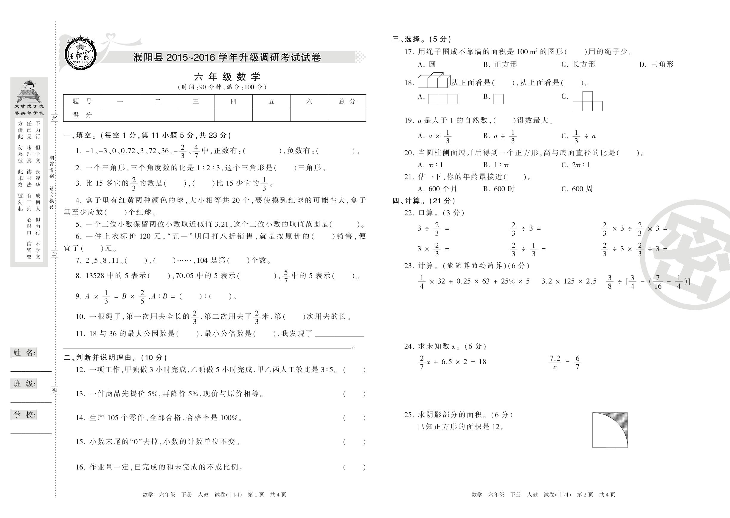 2015-2016学年第二学期濮阳市濮阳县六年级数学试卷(人教版)【14】