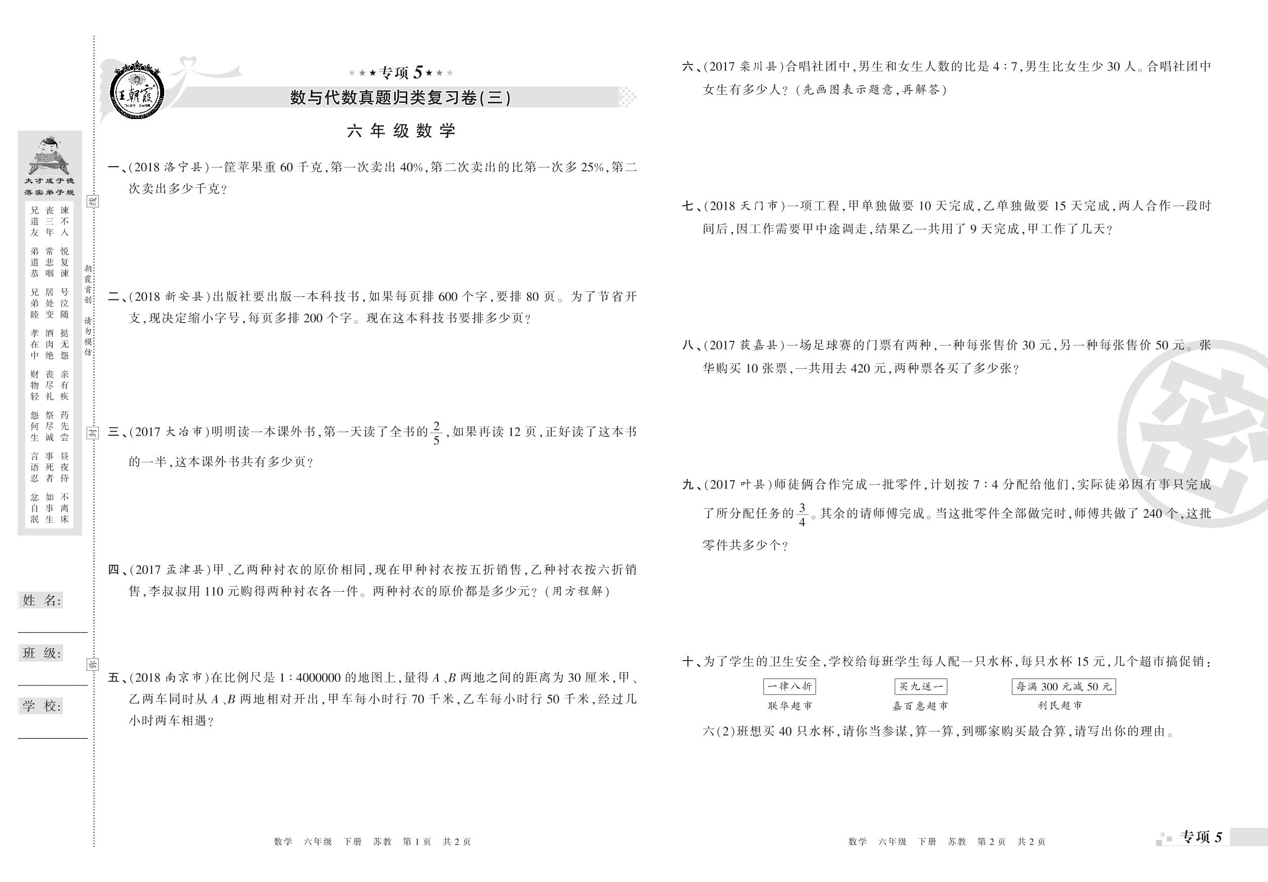 王朝霞期末专项卷——数与代数(三)、图形与几何(一)真题归类复习卷六年级下册数学(苏教版)_R210805101611【0】